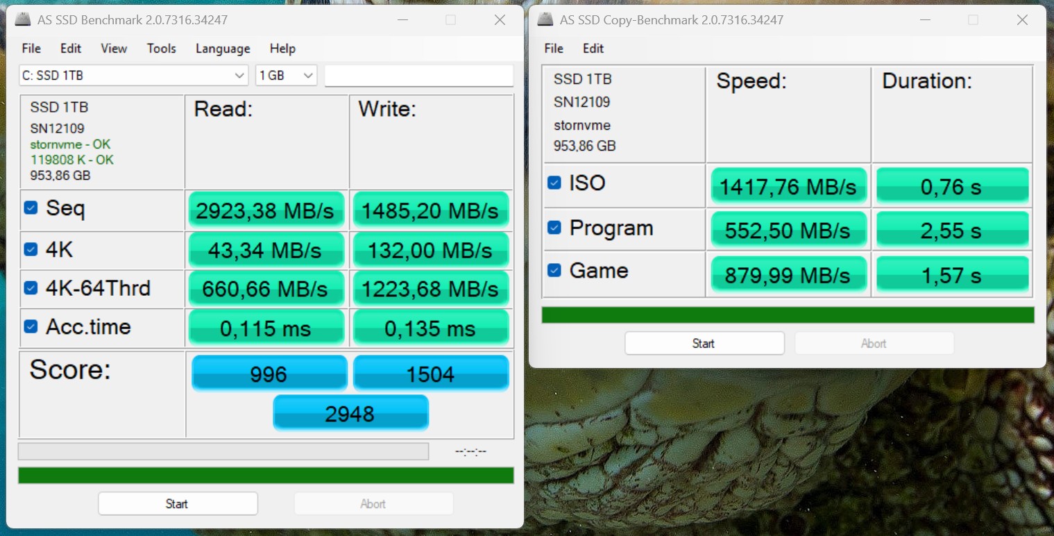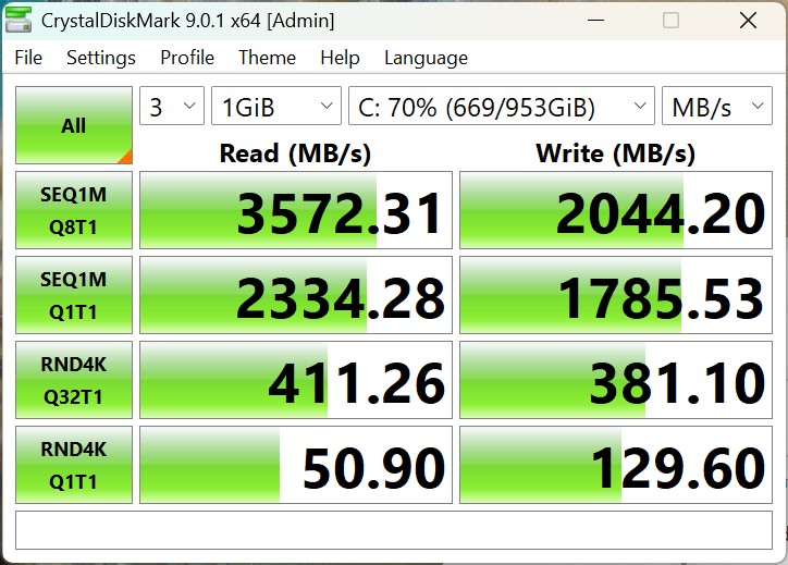 El Alliwava GH8 viene con una unidad SSD de 1 TB, cuyo fabricante no se especifica. Gracias a la conexión mediante PCIe 3.0 x4, no es uno de los modelos más rápidos y se sitúa en el extremo inferior de la comparativa en términos de rendimiento. Sin embargo, el rendimiento es suficiente para las tareas cotidianas y la SSD también funciona de forma estable bajo carga continua.