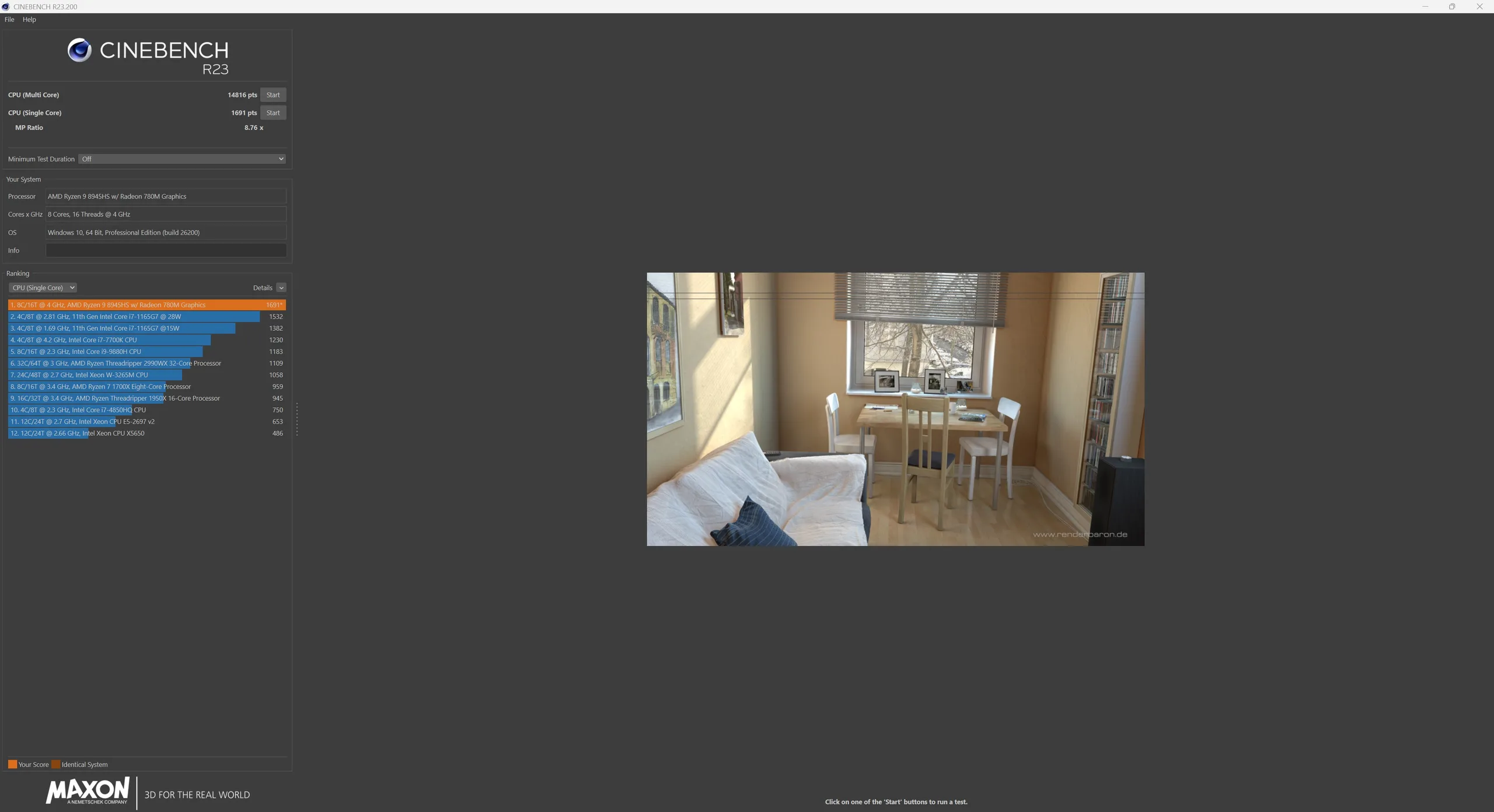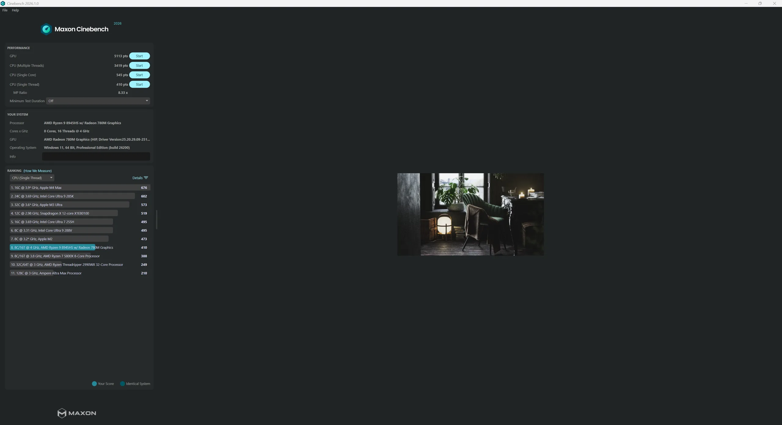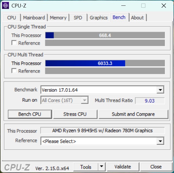 El Alliwava GH8 con AMD Ryzen 9 8945HS (Zen 4, 8 núcleos y 16 hilos) ofrece una gran potencia de cálculo en general y se sitúa en la potente gama media de los mini PC actuales. El SoC puede alcanzar un consumo a corto plazo de hasta unos 65 vatios, pero se estabiliza en unos 55 vatios bajo carga sostenida. En una comparación directa, sin embargo, nuestra muestra de prueba sale perdiendo frente al Geekom A8, que está equipado con un AMD Ryzen 7 8745HS supuestamente más débil.