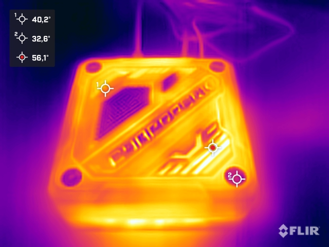 Hay dos zonas principales de temperaturas en la carcasa: por un lado, está la parte superior, donde entra aire fresco para refrigerar el procesador y sale por los laterales de la carcasa. Por otro lado, está la parte inferior, que presenta temperaturas superficiales significativamente más elevadas. El valor máximo aquí se sitúa justo por debajo de los 48 °C en la prueba de estrés. Sin embargo, la parte superior se mantiene significativamente más fría y sólo hay puntos calientes aislados en los tornillos de montaje, ya que éstos están atornillados directamente al disipador de calor.