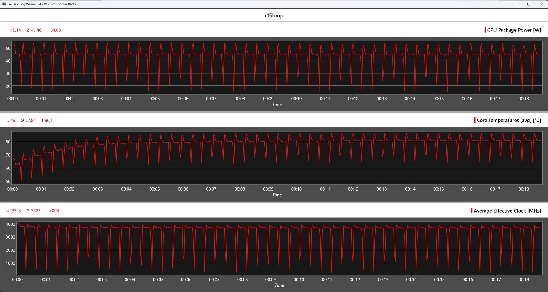 El bucle continuo Cinebench R15 es un verdadero reto para la unidad de refrigeración. Los datos de monitorización muestran que el AMD Ryzen 7 7735HS sólo alcanza el máximo de 54 vatios durante muy poco tiempo. Durante un período de tiempo más largo, la potencia tiene que ser estrangulada a alrededor de 43 vatios. Sin embargo, a 86,1 °C, el SoC aún no alcanza aquí el rango crítico. El Aoostar GOD77 puede asegurarse de nuevo un buen segundo puesto frente a sus competidores. Hay que destacar positivamente el rendimiento estable del procesador.