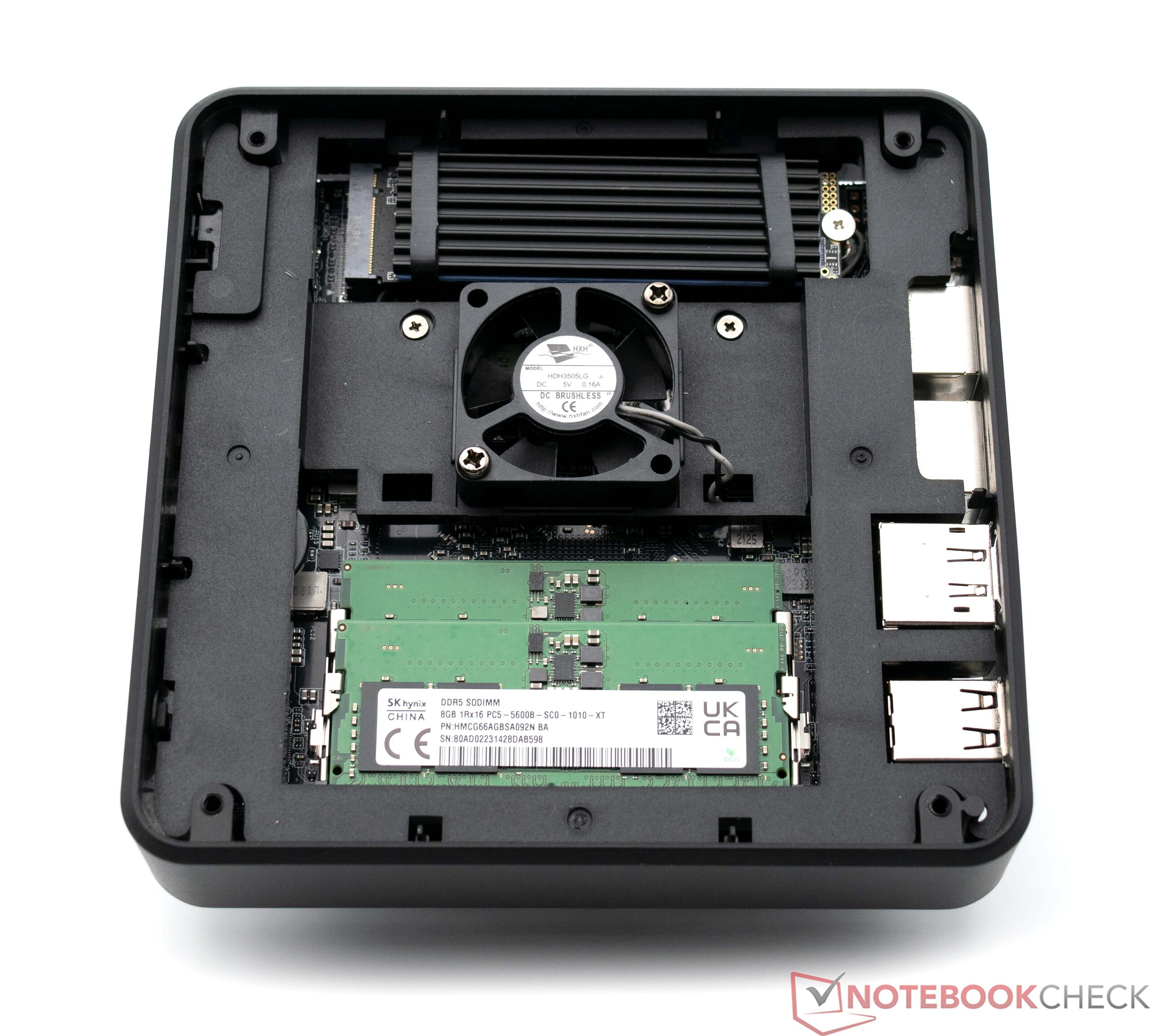 Dado que Aoostar vende el GOD77 como un sistema barebone incluso sin RAM ni SSD, el hecho de que los tornillos para retirar la cubierta de la base estén ocultos bajo unos pies de goma pegados no resulta fácil de usar. Tras desatornillar los cuatro tornillos de la parte inferior, la cubierta puede retirarse fácilmente. La RAM y la SSD son fácilmente accesibles, aunque el módulo WLAN también es de fácil acceso, ya que se encuentra directamente debajo de la SSD. Aoostar instaló un ventilador relativamente pequeño entre la RAM y la SSD en nuestra muestra de prueba. Si se desea instalar un almacenamiento de 2,5 pulgadas, es necesario retirar primero el ventilador.