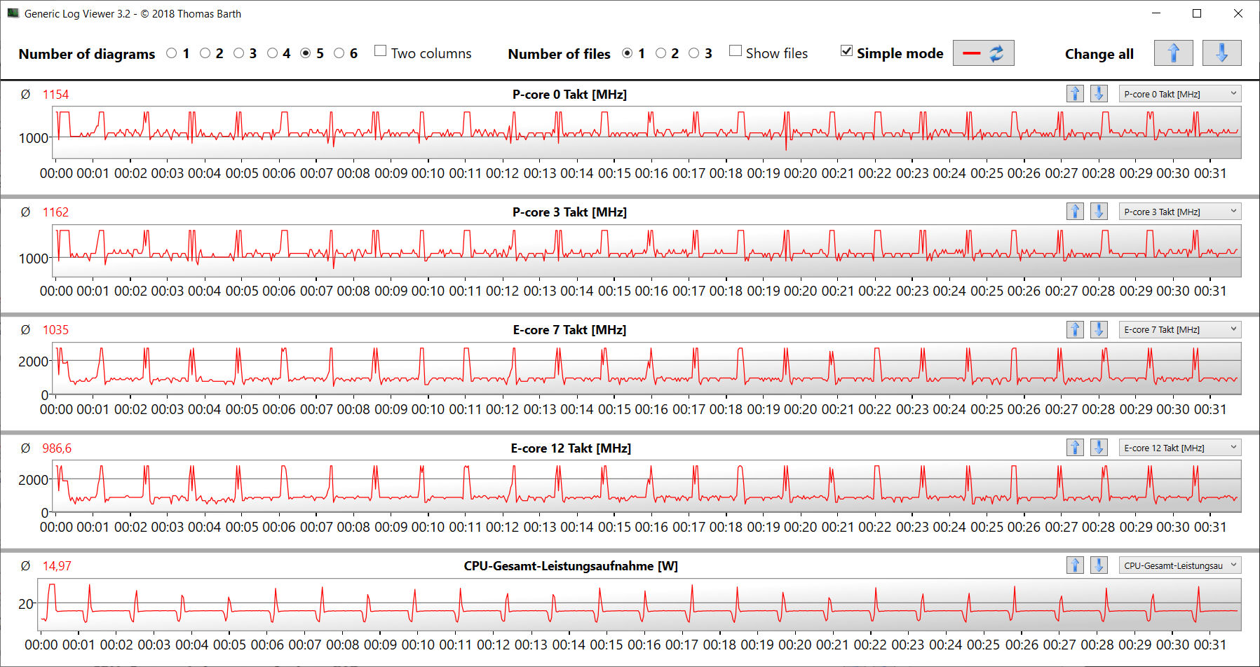 Nuestra prueba de estrés, que consiste en ejecutar Prime95 y FurMark al mismo tiempo de forma continua, representa un escenario extremo diseñado para evaluar la estabilidad de un sistema a plena carga. Durante la prueba (que duró al menos una hora), la CPU funcionó a velocidades de reloj moderadas (núcleos P: aprox. 2,5 GHz; núcleos E: aprox. 2,3 GHz), mientras que la GPU fluctuó entre 1.000 y 1.500 MHz.