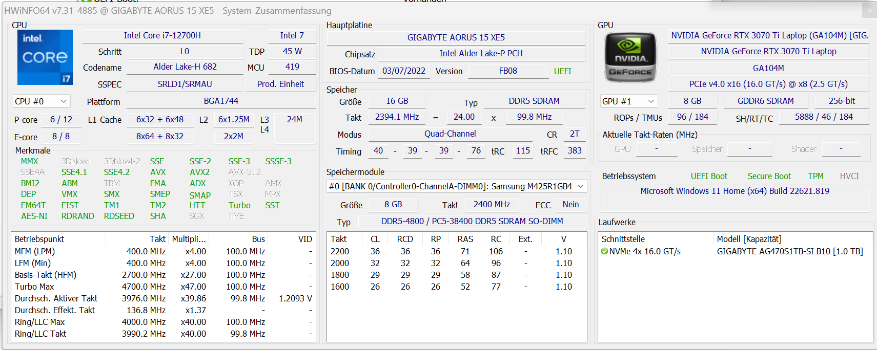 | 85.5 % v7 (old) | 12/2022 | Aorus 15 XE5 i7-12700H, GeForce RTX 3070 Ti Laptop GPU | 2.3 kg | 24 mm | 15.60" | 2560x1440 | |