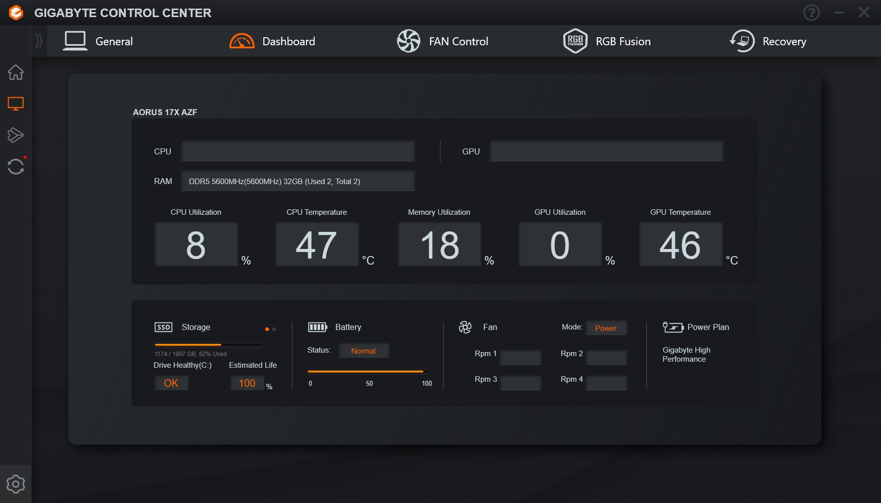 El Gigabyte Control Center (GCC) se usa para controlar y monitorizar los componentes del Aorus 17X AZF. En nuestras pruebas no encontramos problemas con GCC, que puede usarse para regular el rendimiento del portátil y así influir en el ruido de fondo. La curva del ventilador puede ajustarse un poco a través de la pestaña FAN Control. Además, se puede seleccionar un gran número de efectos de retroiluminación para el teclado.