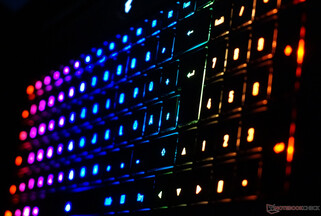 El decente teclado no ofrece un gran recorrido pero sí una cómoda resistencia. El marco apenas se dobla. Al menos, con la iluminación RGB de libre configuración, una gran selección de teclas de función y el bloque numérico de tamaño completo, no hay motivos de queja. Sin embargo, hay que tener cuidado, ya que el teclado es mínimamente más pequeño que el estándar, lo que puede causar cierta irritación al escribir.