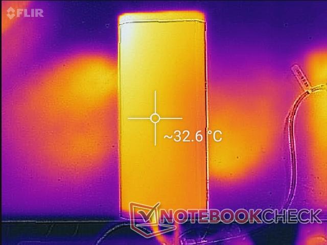 Las temperaturas de la superficie generalmente están en el rango bajo de 30 C cuando se juega. Gran parte de la superficie está dedicada a la ventilación para una refrigeración óptima, pero eso también significa que los usuarios deben dejar un amplio espacio en tres de los cuatro lados de la eGPU para un flujo de aire máximo. Por ejemplo, sería imprudente colocar la unidad directamente contra una pared o de costado. El único lugar que los usuarios deben evitar tocar es la parte trasera de la unidad más cercana al ventilador de la PSU, ya que este lugar puede calentarse a más de 40 C cuando se juega.