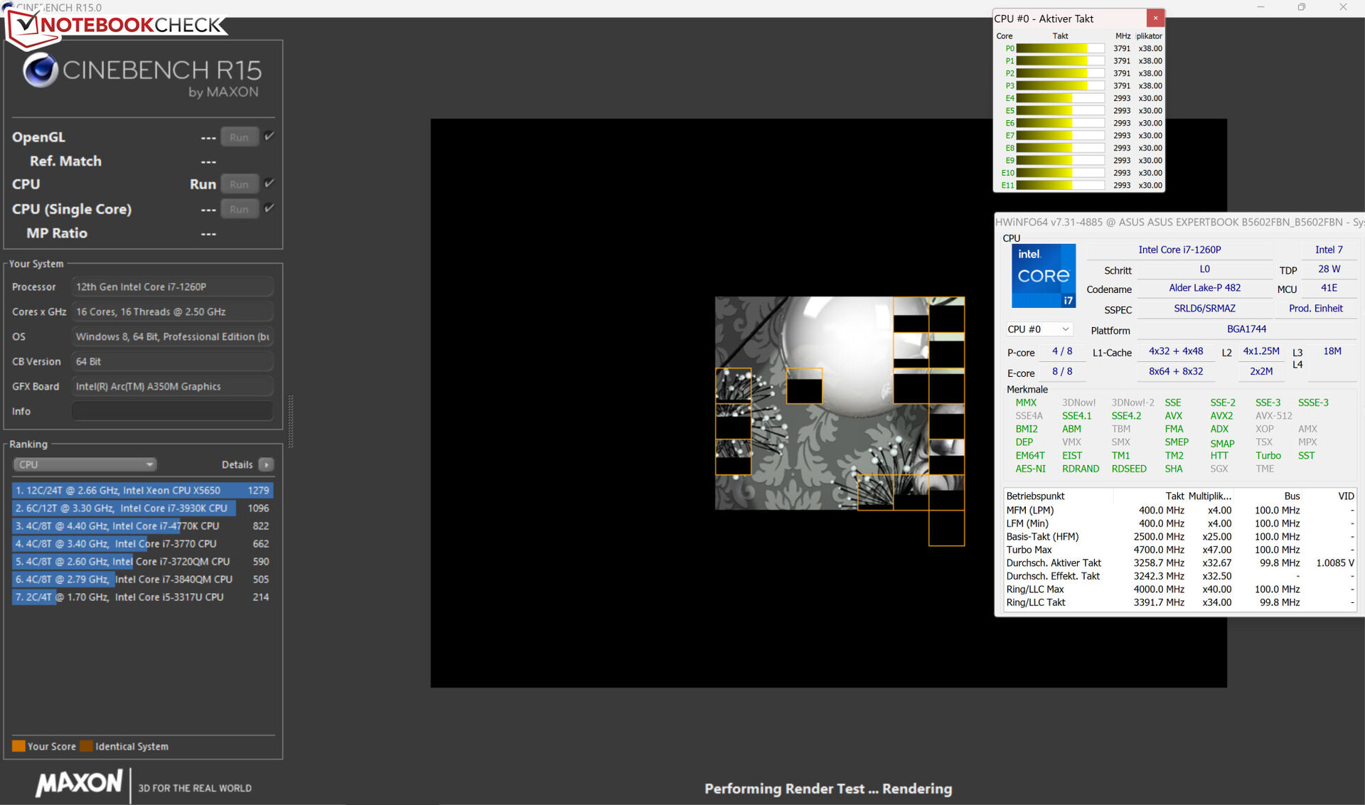 El procesador Core i7-1260P puede amortiguar picos de carga cortos con mucha potencia de cálculo, pero tiene que ralentizarse bajo carga duradera - esto no se aplica a la GPU. El ordenador sólo se calienta moderadamente bajo carga, pero puede generar una cantidad relativamente alta de ruido durante los picos de carga.