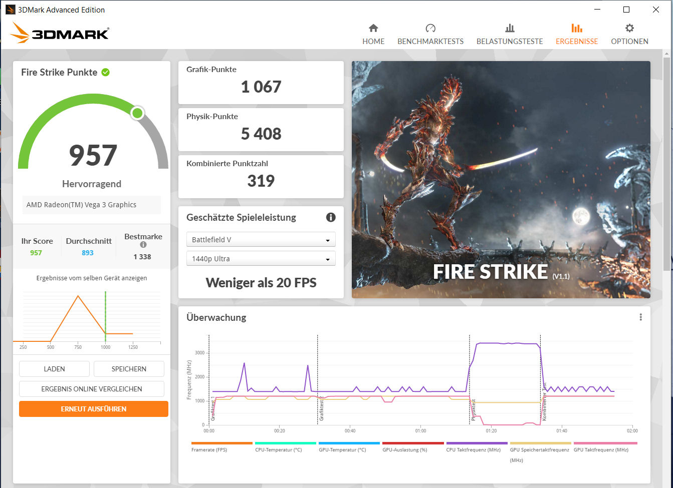 La prueba de estrés (Prime95 y FurMark en funcionamiento continuo) representa un escenario extremo para comprobar la estabilidad del sistema a plena carga. La CPU (3,1, hasta 3,2 GHz) y la GPU (aprox. 1.050 MHz) comienzan la prueba de estrés con frecuencias de reloj relativamente altas, pero las frecuencias caen significativamente a medida que avanza la prueba.