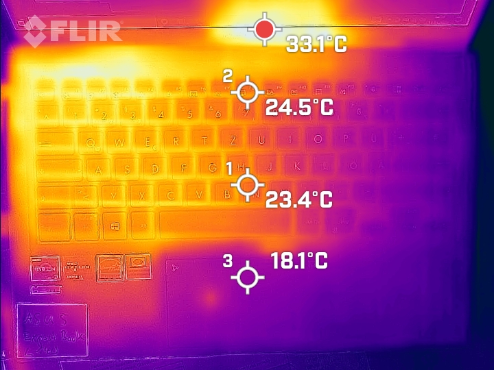 El portátil no se calienta en exceso. Se registra una temperatura superior a 40 grados Celsius en dos puntos de medición durante la prueba de estrés. En el uso diario (oficina, Internet), los valores están en la zona verde - con el "modo estándar" activo. El "modo Susurro" lleva a un nivel de calor comparable al de la prueba de resistencia porque el ventilador funciona con menos frecuencia o más despacio