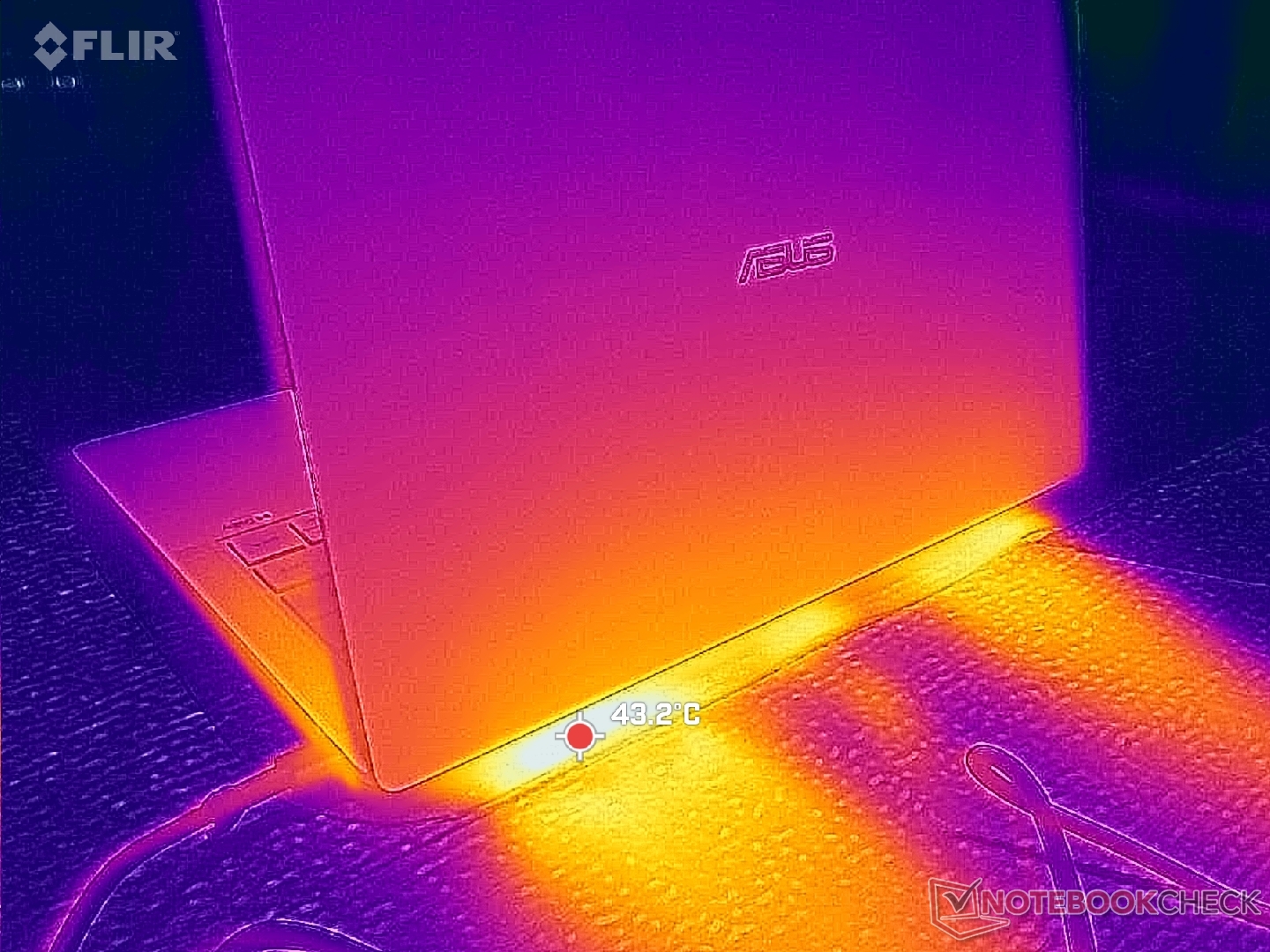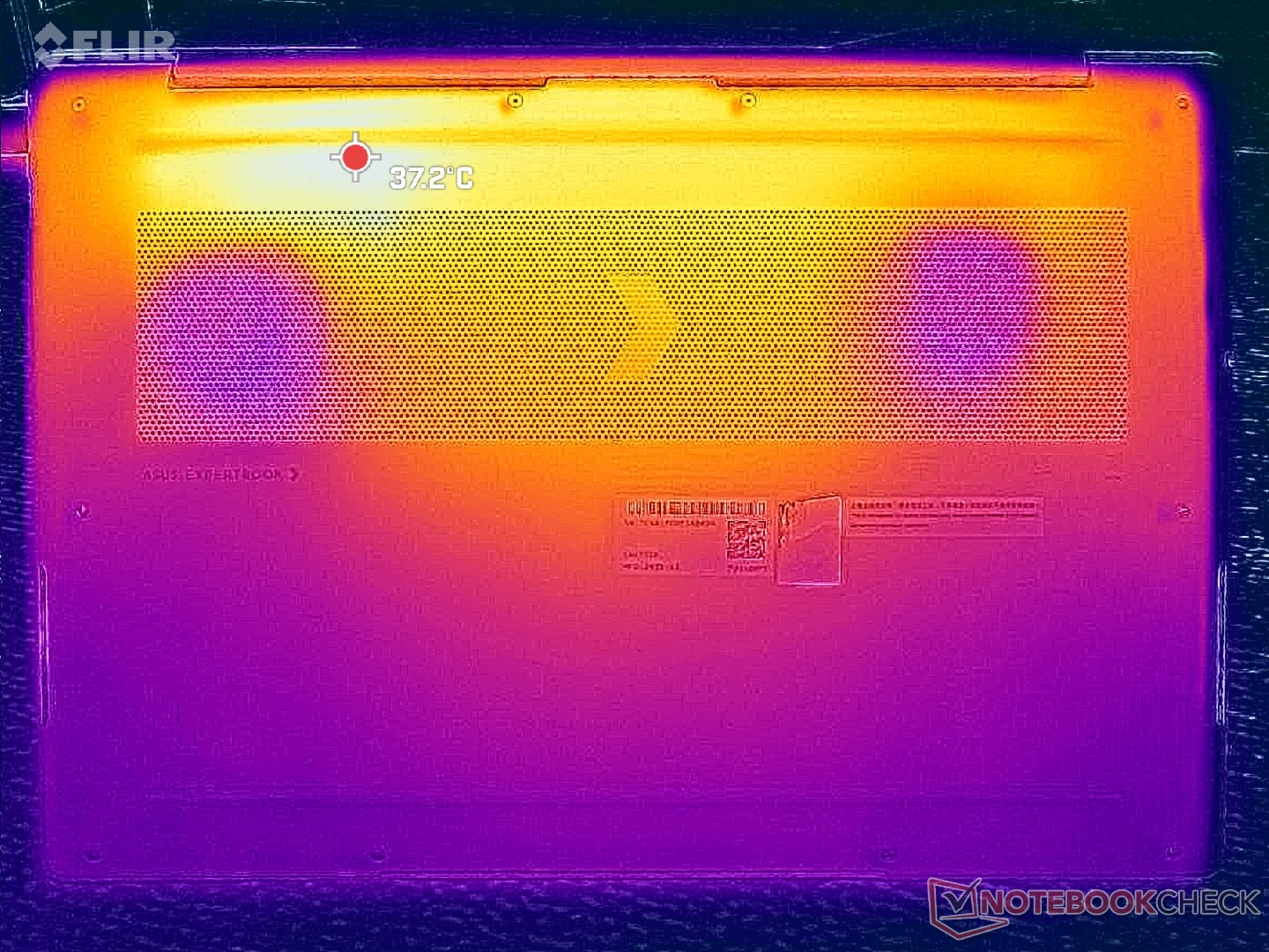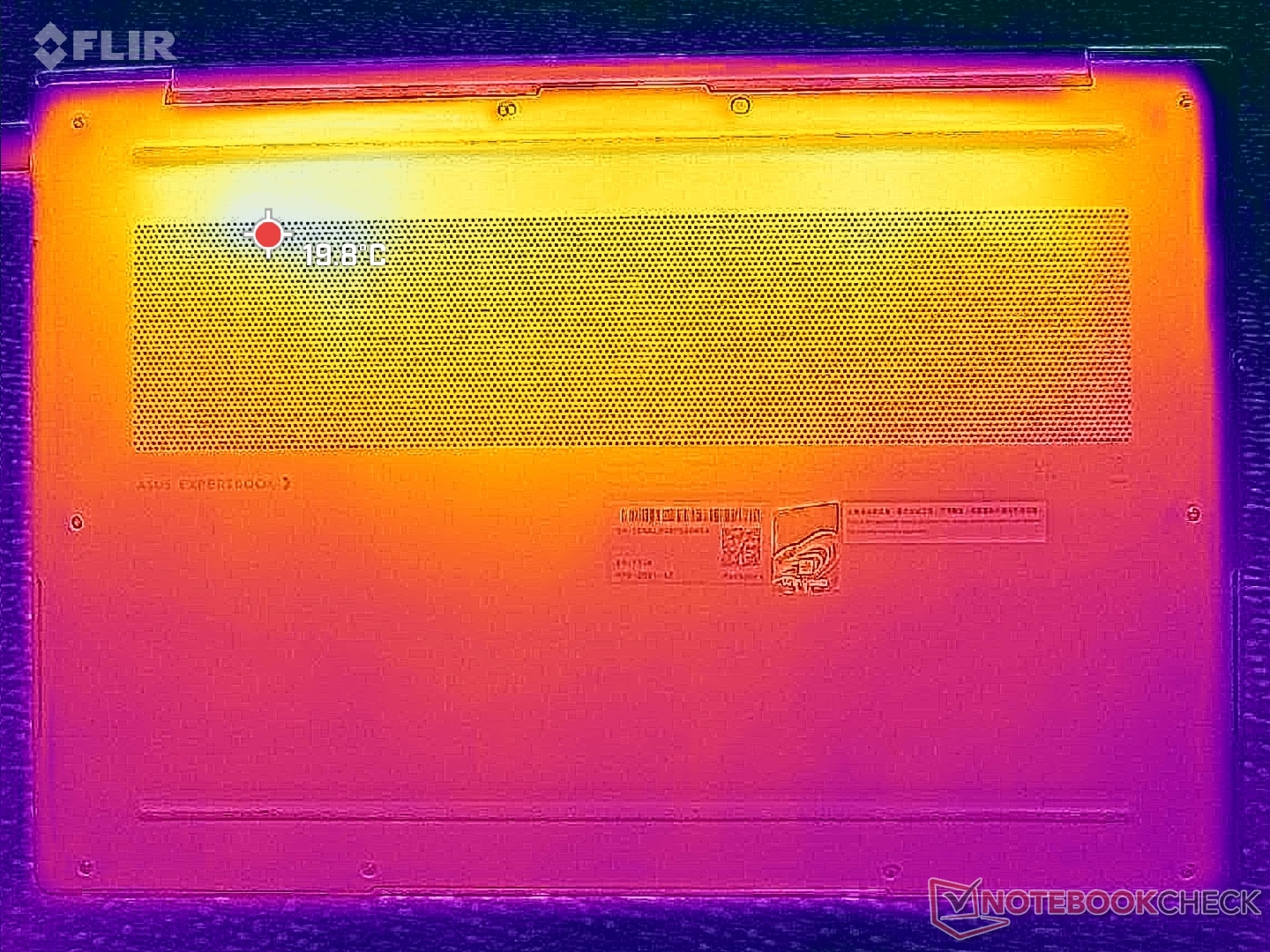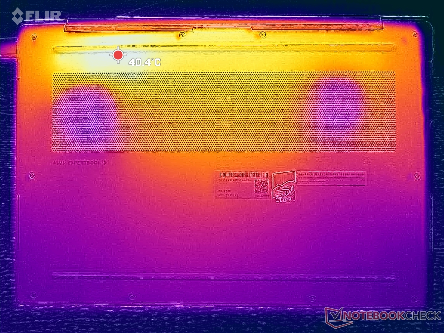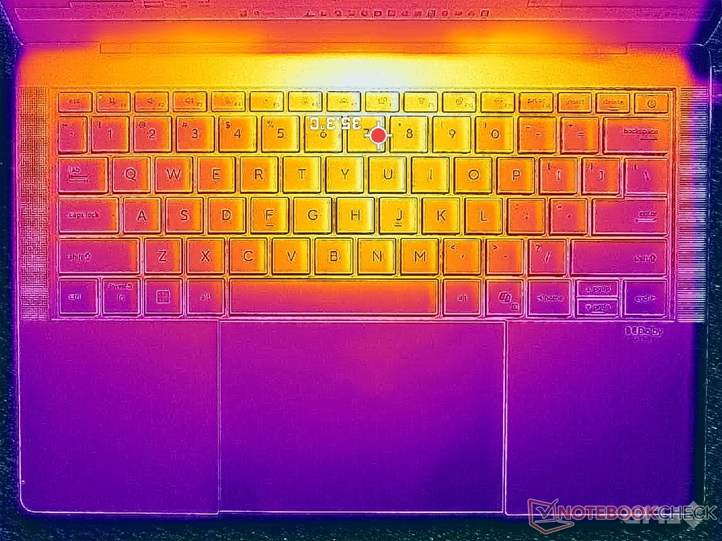 El gradiente de temperatura de la superficie es más o menos simétrico debido a la solución de refrigeración que hay debajo. Los puntos calientes del centro del teclado y del panel inferior pueden alcanzar hasta 41 C cada uno cuando se ejecutan cargas exigentes durante periodos prolongados, lo que es ligeramente más frío que en el HP EliteBook Ultra G1i 14 equipado con una CPU Lunar Lake-V más lenta.