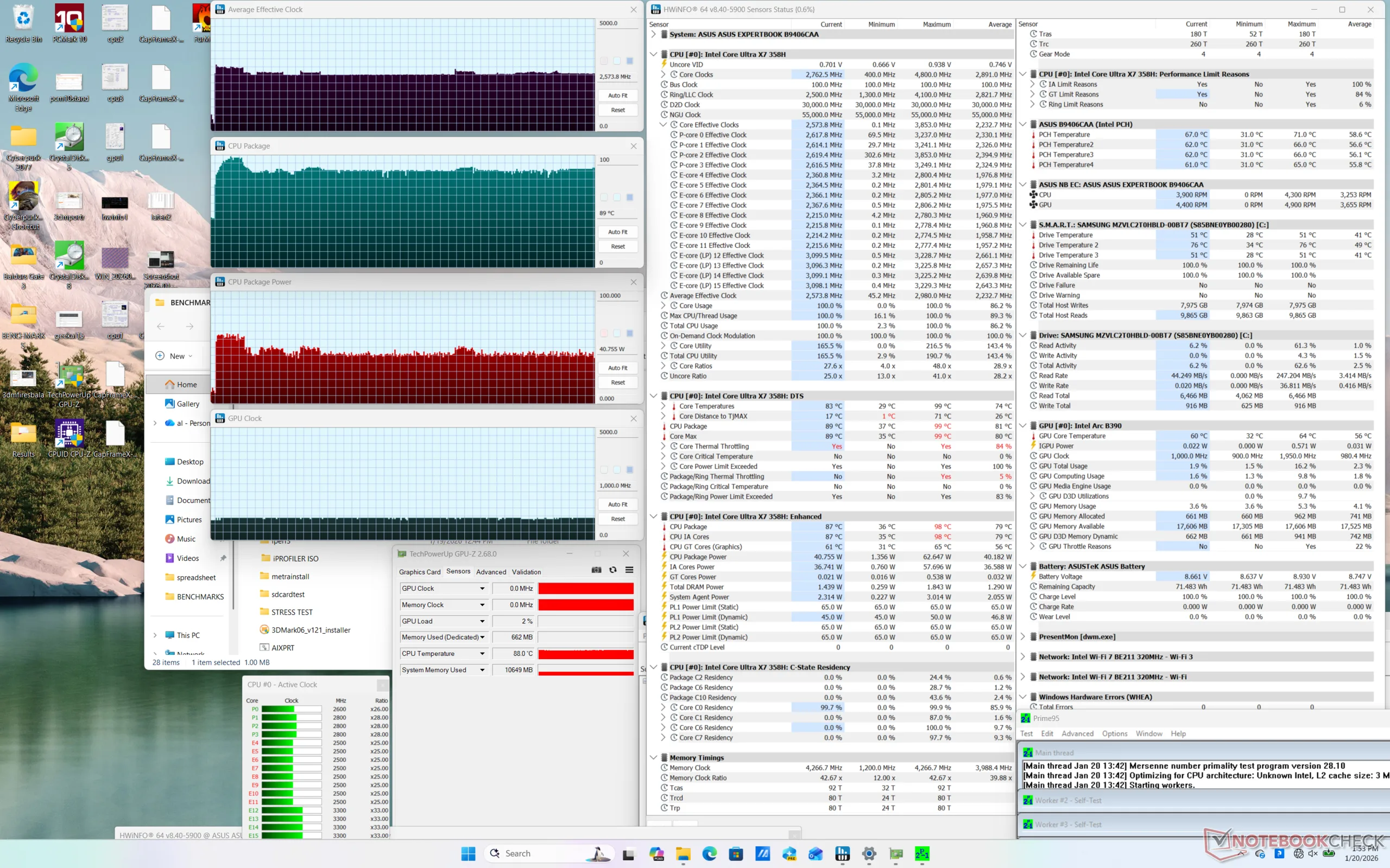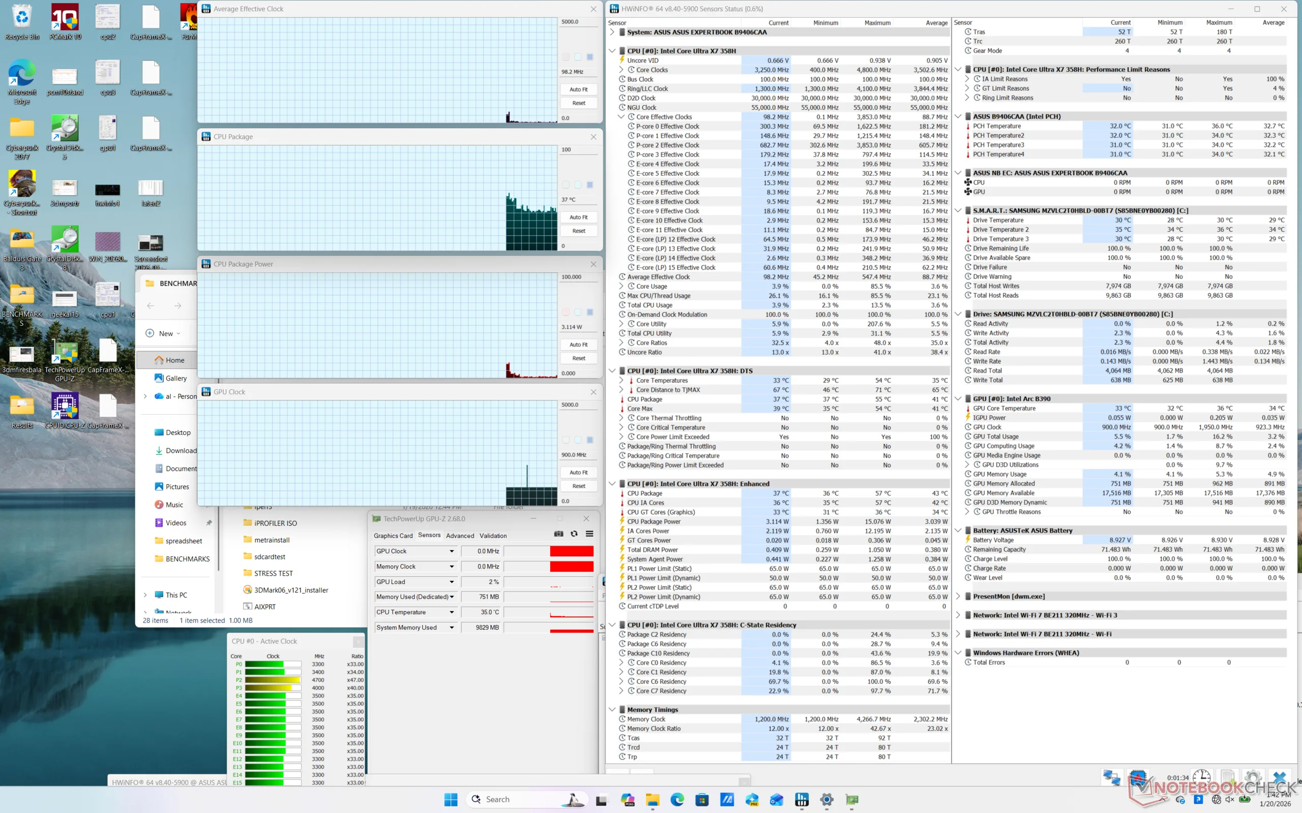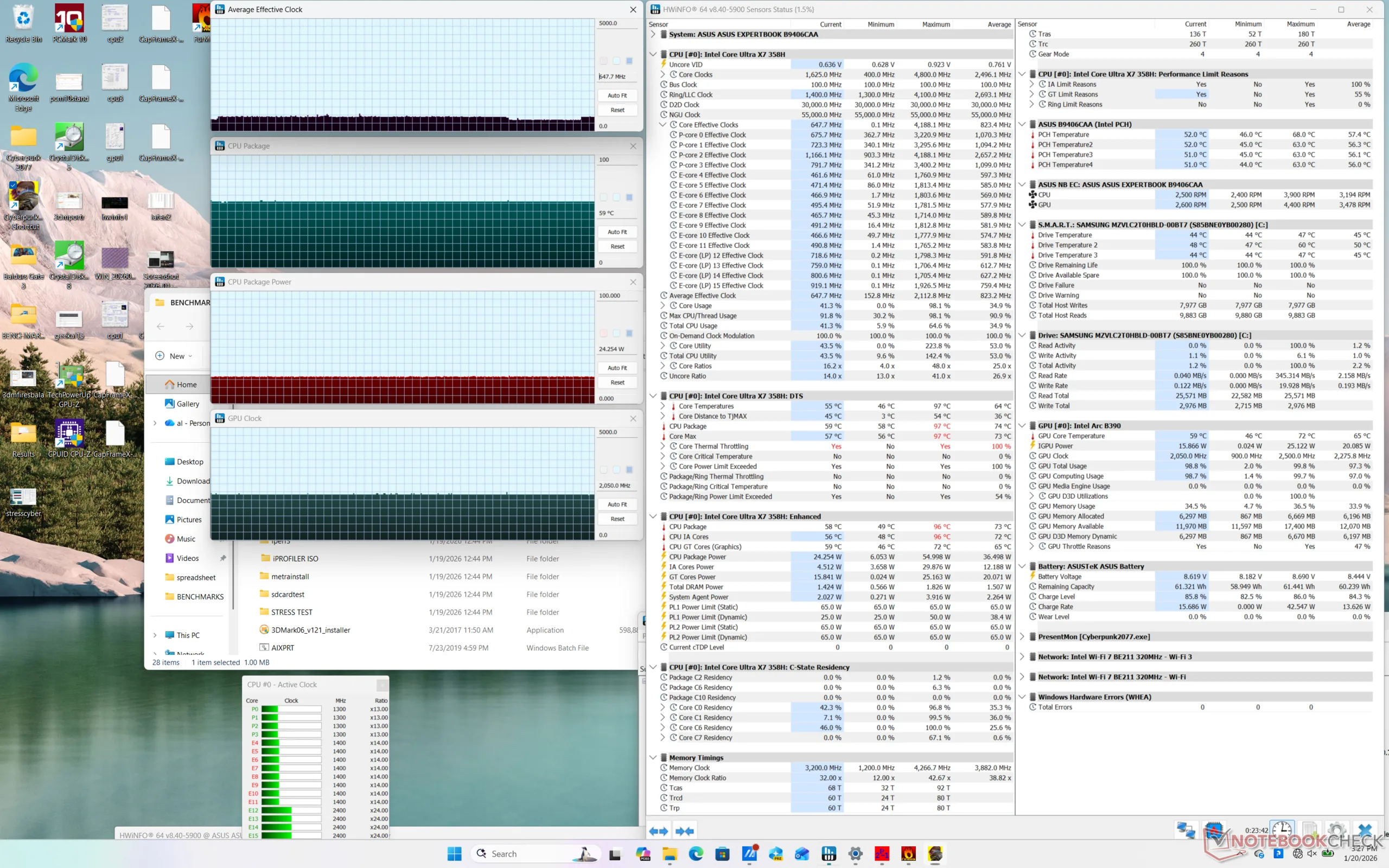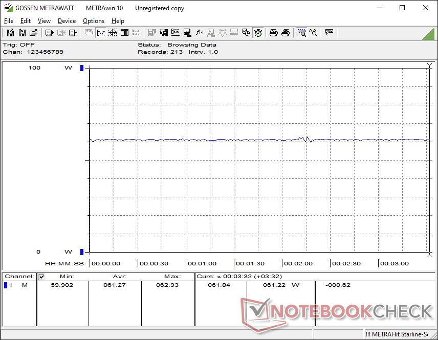 El consumo general es bastante similar al del Lenovo ThinkPad P14s Gen 6 con Ryzen AI 9, aunque con algunas observaciones importantes. En primer lugar, ejecutar Cyberpunk 2077 exige unos 61 W en nuestro Asus frente a los 56 W del Lenovo a pesar de que el Arc B890 rinde hasta un 80 por ciento más rápido, lo que supone una importante ventaja de rendimiento por vatio en lo que respecta a los gráficos. Por otro lado, sin embargo, ejecutar Prime95 consumiría 64 W de media frente a los 55 W del mismo Lenovo, lo que sugiere diferencias relativamente menores en lo que respecta al rendimiento de la CPU por vatio.