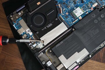 En comparación con su predecesor, su construcción interna ha cambiado mucho. Su RAM está ahora completamente soldada y no hay opción de cambiarla después de comprar el dispositivo. Además, el modelo anterior contaba con una ranura de RAM adicional vacía que permitía insertar un módulo de 32 GB (lo que resultaba en 48 GB de RAM total). Por otro lado, su batería y la unidad SSD M.2-2280 pueden intercambiarse, al igual que el módulo Wi-Fi 6E AX211, si es necesario. Para acceder a las entrañas del convertible, hay que retirar diez pequeños tornillos en cruz, de los cuales el que se encuentra en el centro de la placa inferior tiene una longitud diferente a los demás.