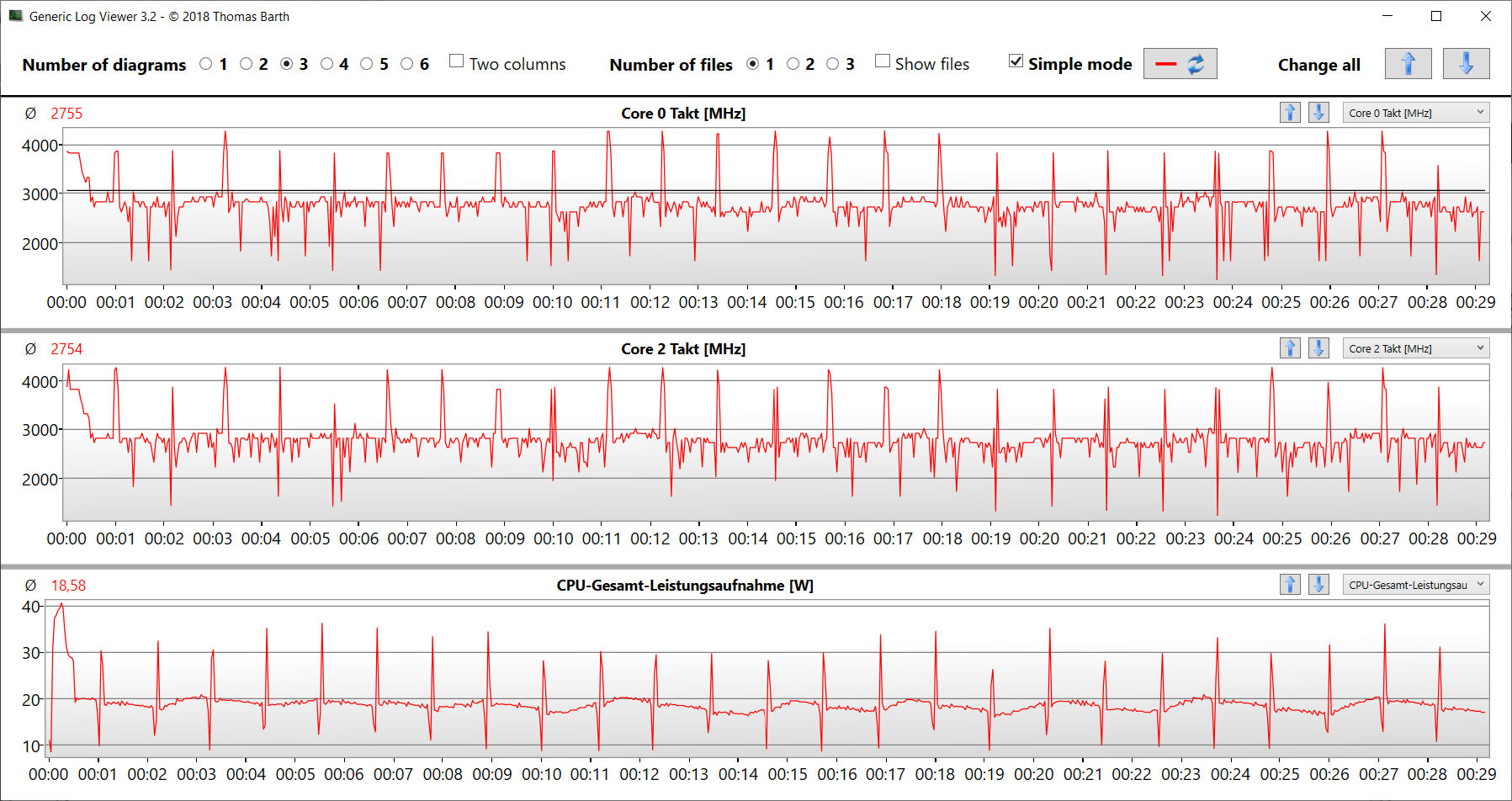El test de estrés (Prime95 y FurMark en funcionamiento continuo) es un escenario extremo para comprobar la estabilidad del sistema a plena carga. La CPU y la GPU inician la prueba con 1,8 GHz y 1.050 MHz, respectivamente. Los valores disminuyen durante el transcurso de la prueba.