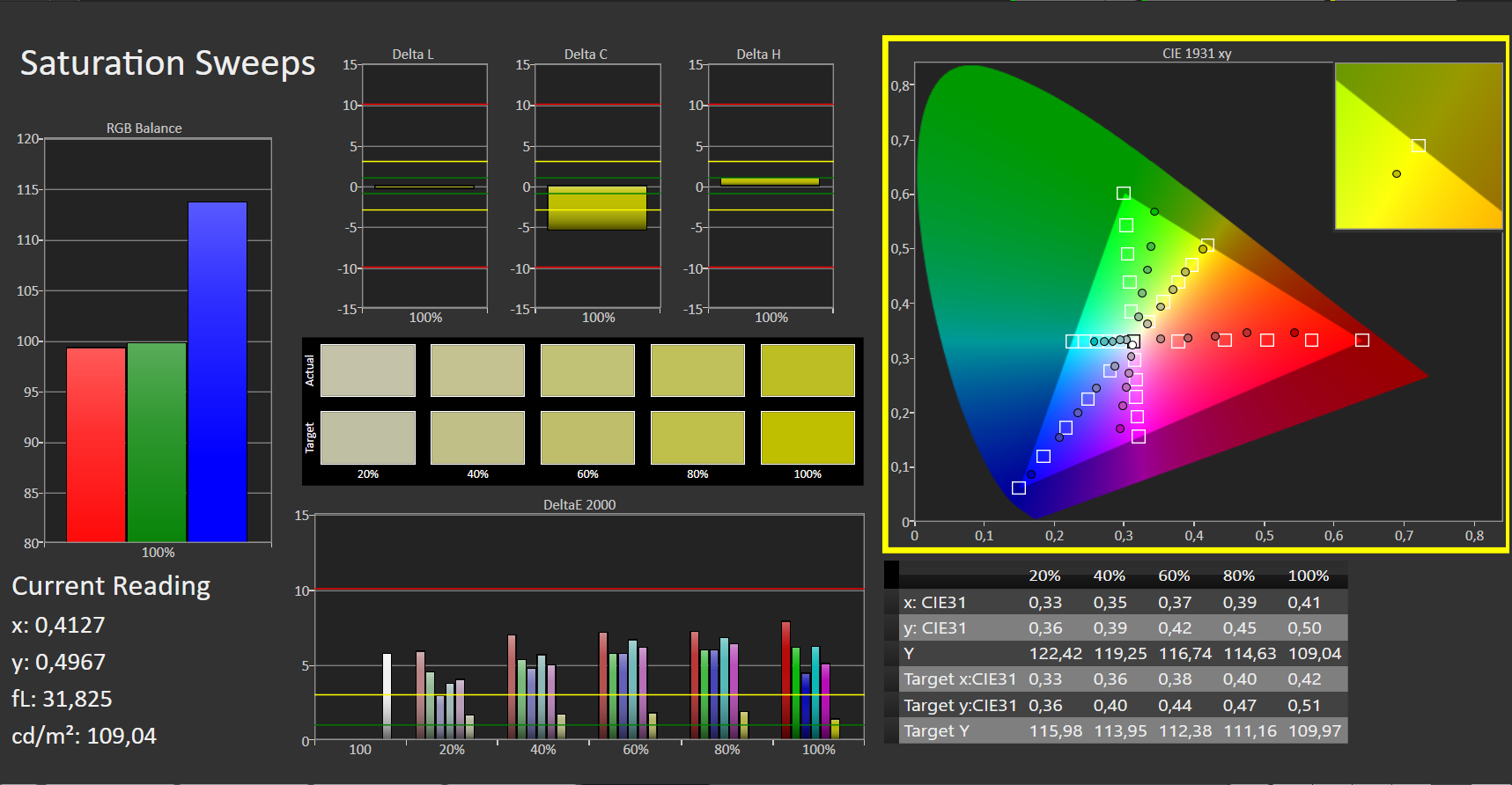 La pantalla muestra unos colores razonablemente decentes por defecto. Sin embargo, el objetivo Delta E < 3 no se alcanza con una desviación de algo menos de 6.