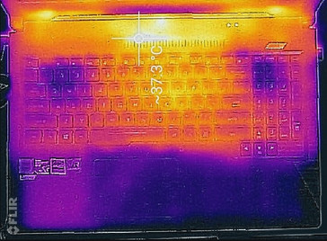 Asus ha hecho un buen trabajo en la gestión del flujo de calor. Las ventilaciones traseras se calientan al tacto (aproximadamente 50-52 ° C), pero el teclado permanece frío. Hay una ventilación directamente sobre el medio de la fila de funciones que se siente caliente cuando el dispositivo está bajo carga, pero las manos de los usuarios no deben tocar esta sección con regularidad. El centro del teclado es la sección más cálida, pero no se pone incómoda.
