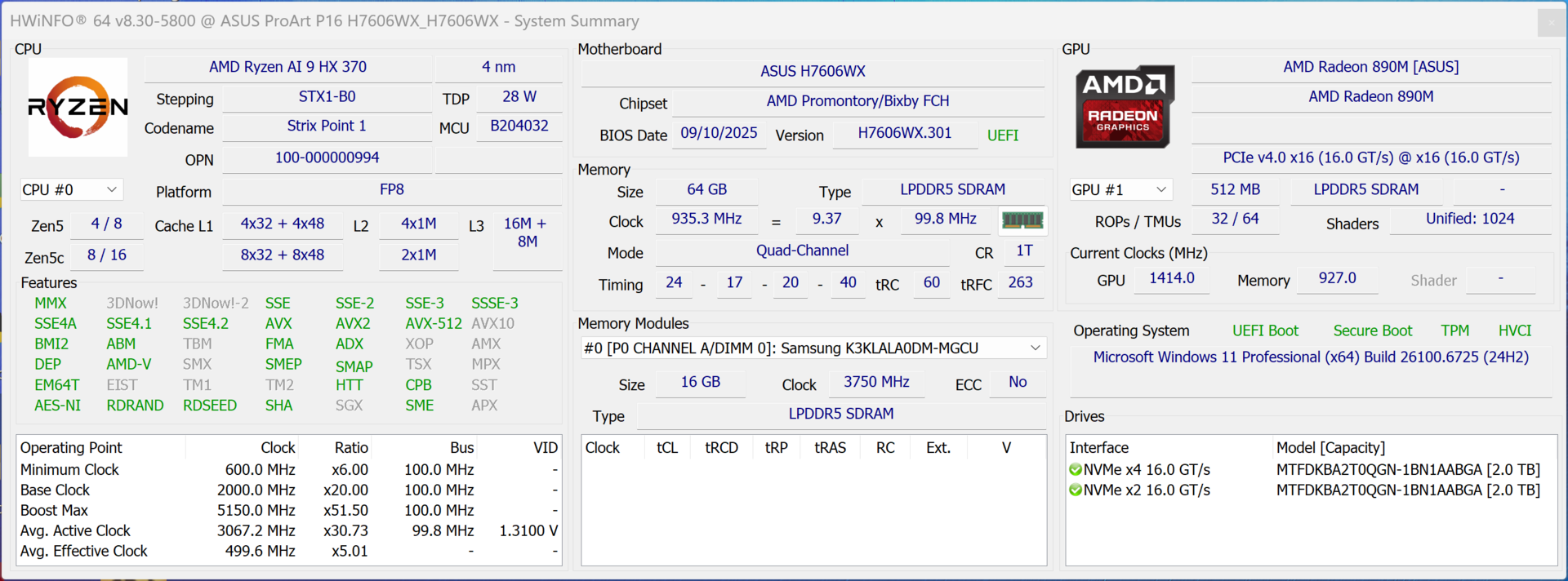| Asus ProArt P16 H7606WP AMD Ryzen AI 9 HX 370 ⎘ Nvidia GeForce RTX 5070 Laptop ⎘ 64 GB Memoría, 2048 GB SSD | Amazon: 1. $3,389.00 HIDevolution [2025] ASUS Pro... 2. $2,929.99 ASUS ProArt P16 AI Creator L... 3. $2,349.00 ASUS ProArt P16 AI Creator L... Precio de catálogo: 3399€ | 1.8 kg | 17.3 mm | 16.00" 2880x1800 212 PPI OLED |