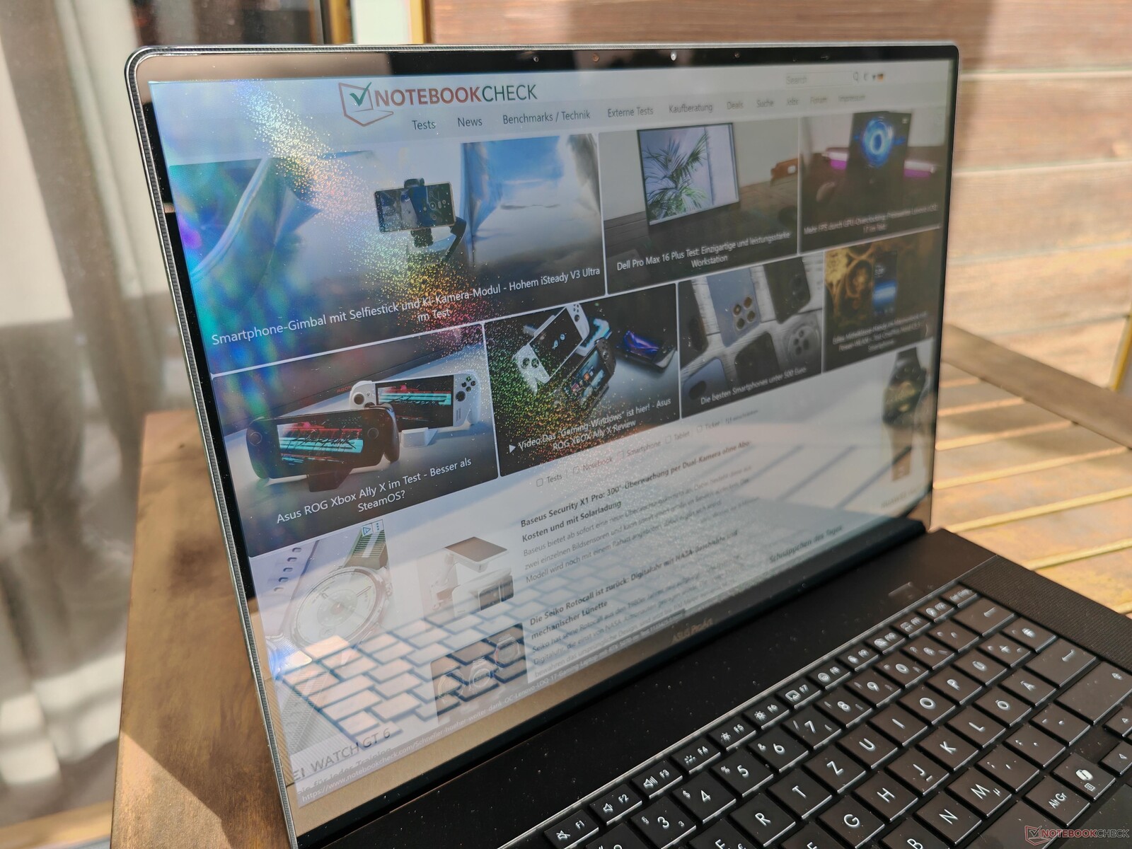 Tanto el ROG Zephyrus G16 como el anterior ProArt P16, con su OLED de 2,8K, no convencían especialmente en lo que a brillo se refiere. Las dos imágenes comparativas de arriba destacan inmediatamente la diferencia que supone el aumento de brillo del nuevo panel Lumina Pro. En lugar de unos 360 cd/m², ahora alcanza los 660 cd/m² en modo SDR. El MacBook Pro (con el sensor de brillo activado) y el Yoga Pro 9i 16 llegan incluso a alrededor de 1.000 cd/m².