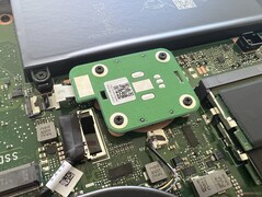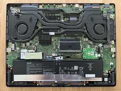 La tapa inferior de la carcasa está asegurada con 10 tornillos Torx (T5) y sigue estando muy apretada después de quitar estos tornillos. La forma más fácil de hacer palanca para abrir la cubierta es en las salidas traseras del ventilador. En el interior domina el gran sistema de refrigeración, y las opciones de mantenimiento también son muy buenas, desde el módulo WLAN (debajo del SSD primario), dos ranuras SO DIMM hasta las dos ranuras M.2 2280 para SSDs. Lo que también llama la atención aquí es cuánto espacio ocupa el DialPad adicional