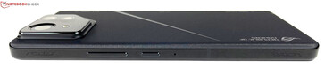 Los dos puertos USB-C son inusuales para un smartphone. Como es habitual, uno está situado en la parte inferior del teléfono, funciona a velocidad USB 3.2 Gen.2 y admite PD 3.0 además de Quick Charge 5.0. En nuestra prueba de copia con el M2.SSD Samsung 980 Pro en la funda Asus ROG Strix Arion (USB 3.2 Gen. 2), el ROG Phone 8 Pro alcanzó una velocidad de transferencia de 299,8 MB/s - definitivamente no es un mal valor, pero un poco pobre dado el ancho de banda de 10 GBit/s del puerto USB 3.2 Gen.2.