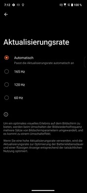 El panel OLED LTPO de 2400 x 1080 píxeles de resolución del ROG Phone 8 Pro soporta HDR10 así como HDR HLG y funciona a una frecuencia de refresco de hasta 165 Hz. En la configuración predeterminada, esto se ajusta automáticamente al contenido que se muestra. Sin embargo, también puede ajustarse manualmente a 60, 120 o 165 Hz.