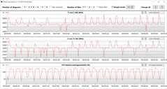 La prueba de estrés (con Prime95 y Furmark funcionando constantemente) representa un escenario extremo para evaluar la estabilidad del sistema a plena carga. La CPU alcanza velocidades máximas de 2,5 a 2,6 GHz (núcleos P) y de 2,2 a 2,3 GHz (núcleos E). La GPU (de 1,9 a 2 GHz) comienza la prueba casi a plena velocidad y ésta desciende ligeramente a medida que la prueba continúa. Además, la GPU se ralentiza regularmente de forma significativa.