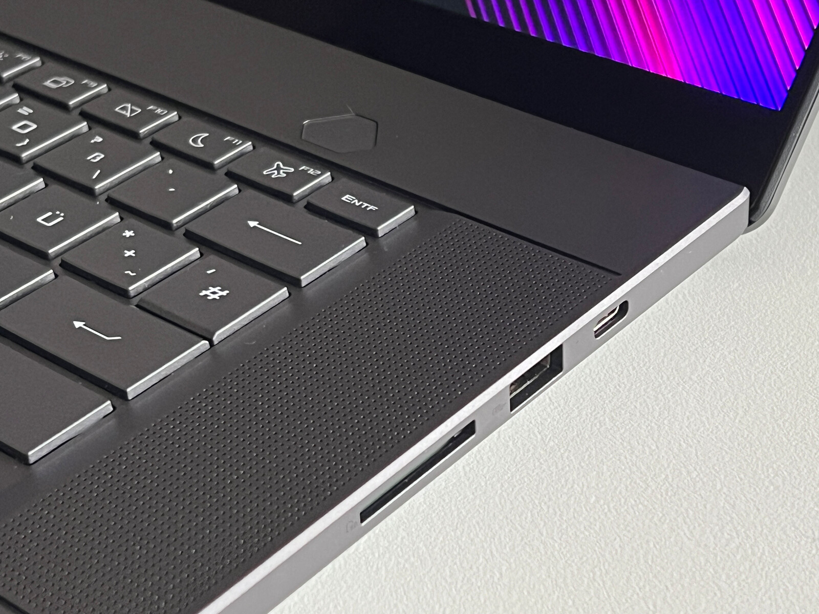 Asus ha renunciado a la extensa pantalla matricial en la tapa del nuevo modelo y, a cambio, incorpora una fina tira diagonal de luz blanca (Slash Lighting) compuesta por 28 mini LED y 7 zonas diferentes. Puede programarse (por ejemplo, como luz de notificación) o, alternativamente, puede desactivarse por completo si no desea llamar demasiado la atención sobre el dispositivo. Aparte del teclado, no hay más elementos iluminados.
