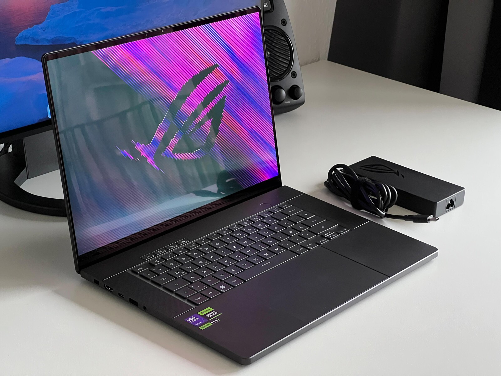 La parte trasera está completamente ocupada por la refrigeración, por lo que los puertos están repartidos entre ambos lados del portátil. Asus utiliza ahora un nuevo conector de alimentación rectangular que se ha colocado en la parte posterior izquierda de la carcasa. El dispositivo cuenta con todas las conexiones importantes, ya que además de USB-C, también dispone de USB-A, una salida HDMI completa y un lector de tarjetas. Ambos puertos USB-C admiten Power Delivery de hasta 100 vatios y el de la izquierda es compatible con Thunderbolt 4. Sólo carece de conexión Ethernet; si la necesita, tendrá que utilizar un adaptador USB.