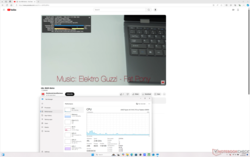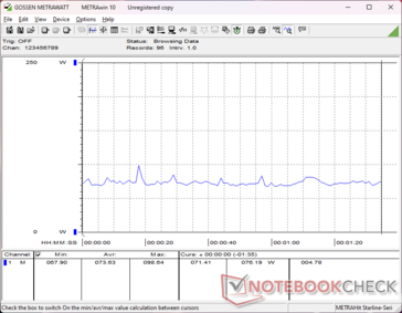 El consumo total es relativamente alto incluso en reposo en el escritorio, dependiendo de su configuración. Si se activan los modos Ahorro de batería y MSHybrid, por ejemplo, el consumo podría ser de tan sólo 9 W. Si se activan los modos dGPU y Turbo, el consumo aumentaría a 23 W.
