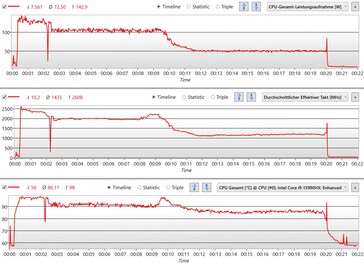 A máxima potencia del ventilador y máxima carga, la temperatura de la CPU sube hasta casi 100 °C, y la de la GPU supera los 90 °C. El procesador, en particular, tiene que ralentizarse muy rápidamente. Su velocidad de reloj se mantiene estable en 2,0 GHz después de unos 2 minutos.