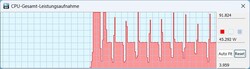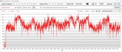 La velocidad de reloj de la CPU se mantuvo sorprendentemente constante durante nuestra prueba de estrés de una hora. Se alcanzó una media de unos 3,1 GHz. La CPU se calentó hasta unos 72 °C y tuvo un TDP constante de 45 vatios.