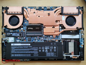 Después de quitar los tornillos, es súper fácil sacar la placa inferior sin necesidad de herramientas. Debajo, se puede ver el sistema de refrigeración que consta de dos ventiladores y un montón de cobre en el medio, los dos bancos de RAM de los cuales uno está desocupado, el SSD intercambiable, así como el módulo WiFi intercambiable.