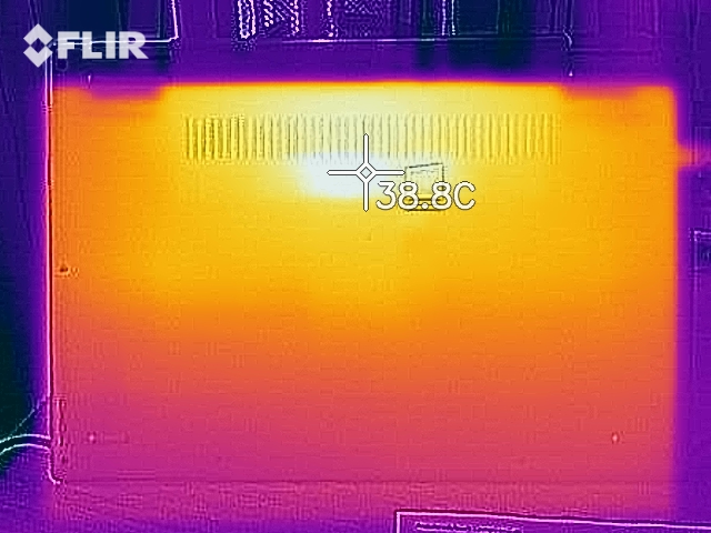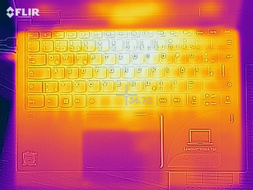 En nuestra prueba de esfuerzo (Prime95 y Furmark funcionando durante al menos una hora), el Yoga funciona de manera similar cuando está conectado y cuando funciona con batería: el procesador comienza la prueba con una velocidad de reloj de 1.8 GHz. Después de unos minutos, se reduce a 1 a 1,1 GHz y funciona de manera constante en este nivel. La unidad de gráficos funciona a 650 a 700 MHz. El descapotable no se calienta demasiado. Durante la prueba de esfuerzo, la marca de 40 grados Celsius (104°F) se excede solo en un punto de medición.