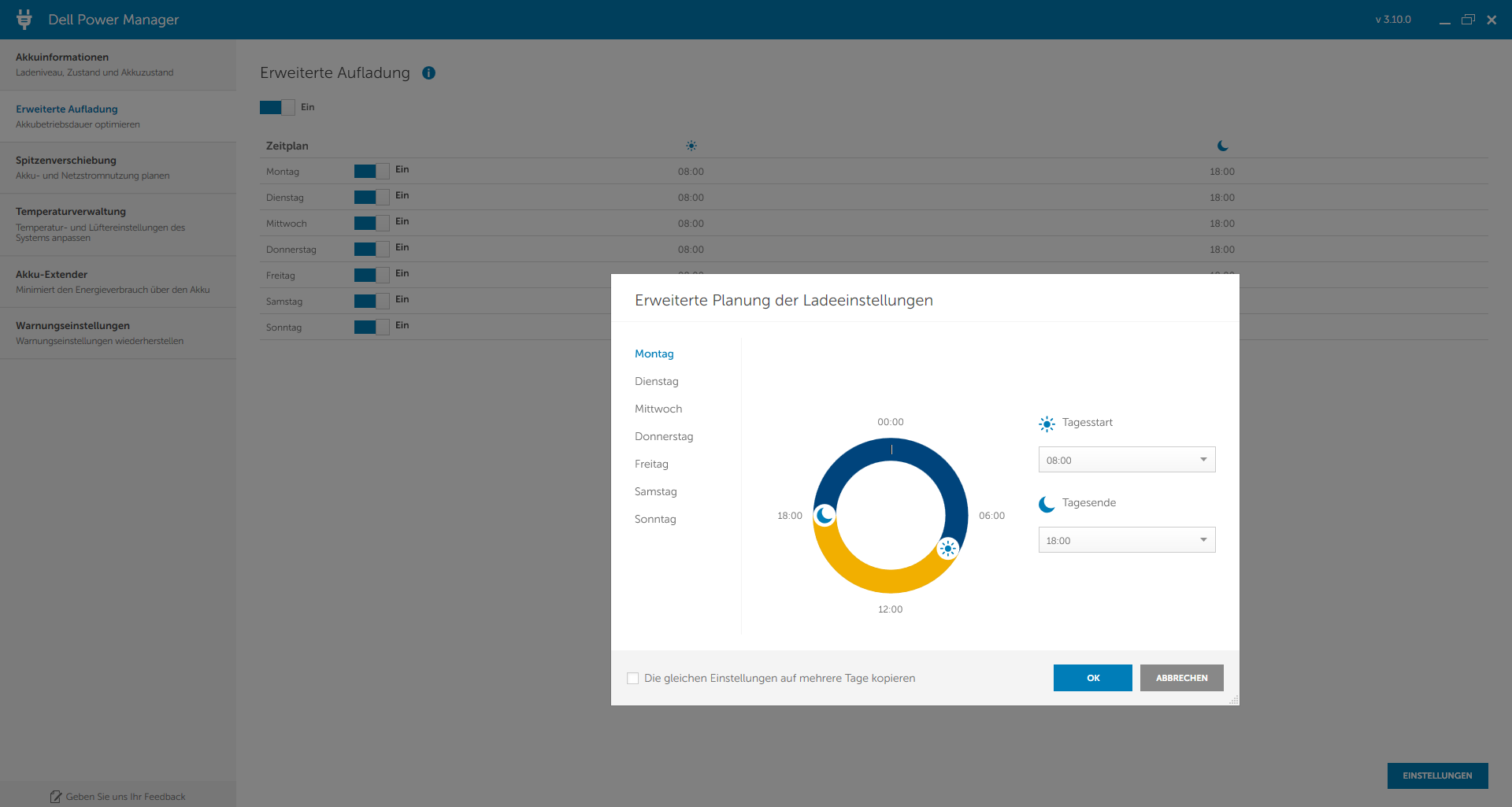 El Power Manager de Dell permite interesantes opciones relacionadas con la carga y la gestión de la energía. Por ejemplo, los operadores de un panel solar pueden elegir cargar el portátil sólo durante el día y depender estrictamente de la batería por la noche - incluso cuando el adaptador AC está conectado.