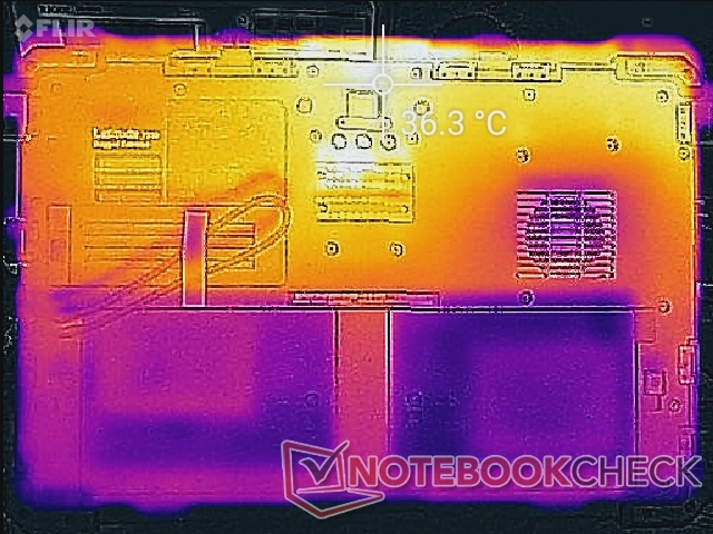 Las temperaturas de la superficie nunca son incómodamente cálidas ya que tiene un chasis más grande de lo habitual para una CPU de la serie ULV U. Pudimos registrar puntos calientes de sólo 31 C y 36 C en las superficies superior e inferior, respectivamente, en comparación con los 37 C y 46 C del Acer Enduro Urban N3.