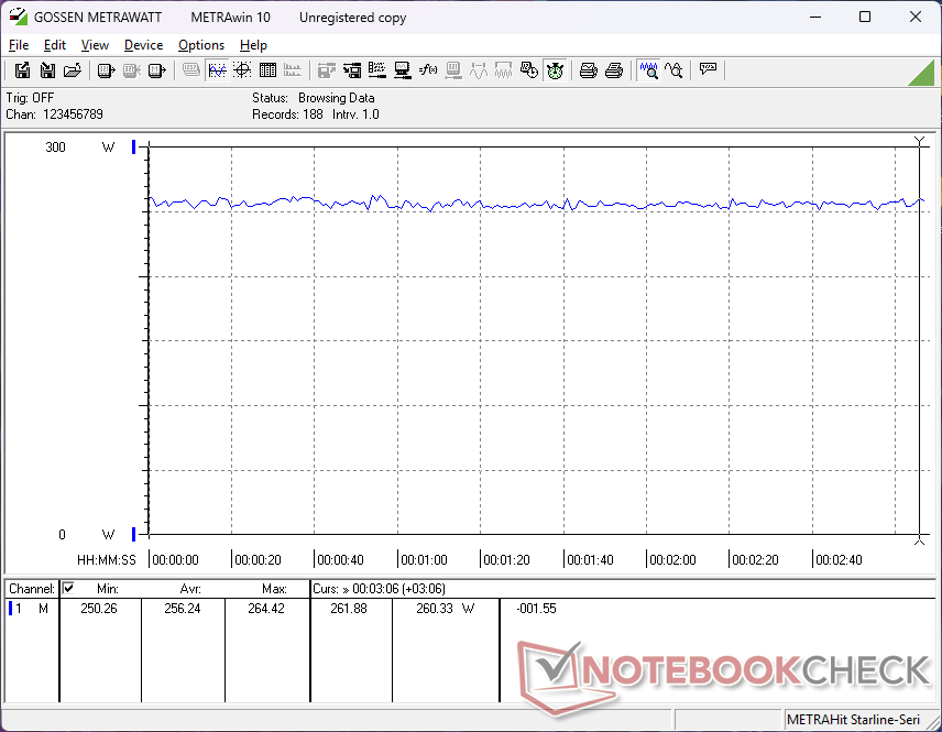 Ejecutar cargas exigentes como Cyberpunk 2077 demanda casi 260 W del adaptador de CA USB-C de 280 W (~16,2 x 7,8 x 2,3 cm). Espere que las tasas de carga sean muy lentas si ejecuta cargas exigentes simultáneamente. En comparación, el HP ZBook Fury G1i 18 se entrega con un adaptador de CA más voluminoso de 330 W para unos máximos de rendimiento potencialmente superiores y unas velocidades de carga más rápidas.