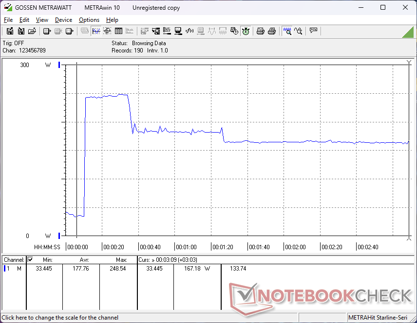 En ralentí puede consumir tan sólo 6 W hasta 32 W si está en el ajuste de brillo máximo con la GPU discreta activa. Este mínimo es inferior al de la mayoría de portátiles de 18 pulgadas, lo que explica la duración relativamente larga de la batería en la siguiente sección.