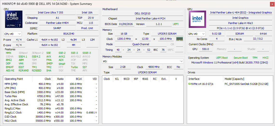 | Dell XPS 14 Core Ultra 7 355 Intel Core Ultra 7 355 ⎘ Intel Graphics 4 Xe3 Panther Lake iGPU ⎘ 16 GB Memoría, 512 GB SSD | Amazon: Precio de catálogo: 1600 USD | 1.5 kg | 15.2 mm | 14.00" 1920x1200 162 PPI IPS | |