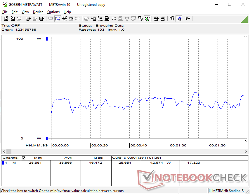 Por lo demás, el adaptador universal USB-C AC de 100 W es idéntico en todas las configuraciones del XPS 14 2026. Dado que el potencial Turbo Boost es menor en el Core Ultra 7, sin embargo, sólo somos capaces de alcanzar un consumo máximo de 80 W cuando la CPU está totalmente estresada en comparación con 101 W en la configuración Core Ultra X7.