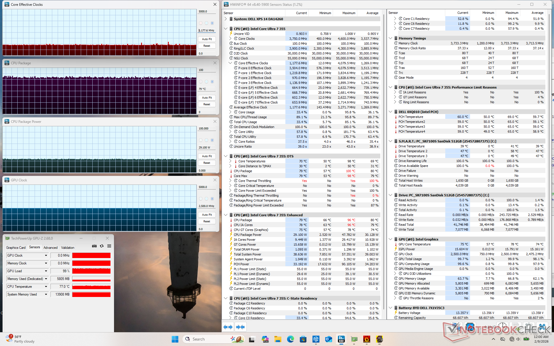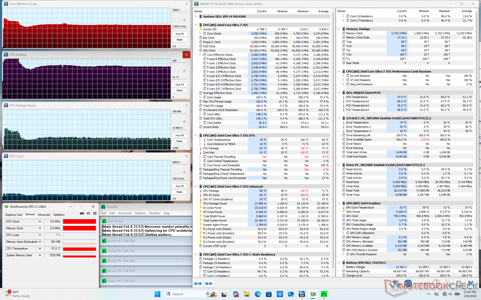 Al ejecutar el estrés Prime95, la CPU aumentaría a 3,7 GHz y 54 W durando sólo unos segundos a 100 C. Después, se estabilizaría a 2,9 GHz, 28 W y 81 C para representar el potencial limitado de Turbo Boost. La temperatura del núcleo se estabilizaría en el rango inferior de 80 C cuando se ejecutan cargas exigentes, lo que es ligeramente más frío que lo que registramos en el Arrow Lake-H del año pasado Dell 14 Premium.