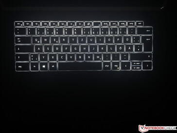 Tanto el teclado como el enorme panel táctil son también familiares desde el modelo anterior y no hay mucho más que contar. La experiencia de teclear se beneficia de la precisa retroalimentación e incluso las pruebas más largas no son un problema, pero aún podría ser mejor. Algunos modelos comerciales (incluidos los portátiles de Dell) tienen teclados aún mejores. La iluminación blanca del teclado puede ser un poco problemática en combinación, porque apenas hay contraste dependiendo de la iluminación ambiental. Obviamente, esto no es un problema en ambientes oscuros.