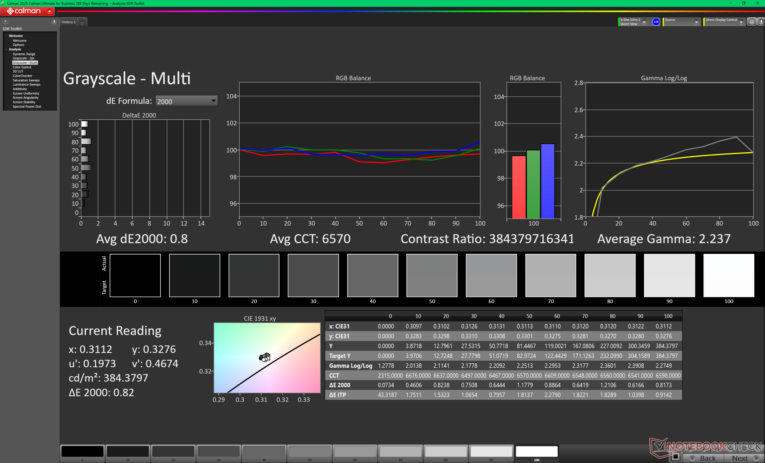El panel viene decentemente calibrado con respecto a la norma P3, con valores DeltaE medios en escala de grises y color que alcanzan 1,9 y 3,69, respectivamente. Por tanto, la calibración adicional no es necesaria para la mayoría de los usuarios finales.
