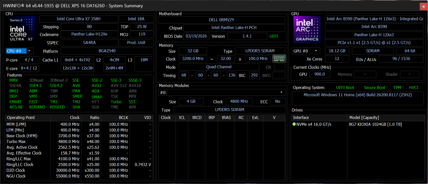 | Dell XPS 16 Core Ultra X7 358H Intel Core Ultra X7 358H ⎘ Intel Arc B390 12 Xe3 Panther Lake iGPU ⎘ 32 GB Memoría | Precio de catálogo: 2350 USD | 1.7 kg | 14.62 mm | 16.00" 3200x2000 236 PPI OLED | |