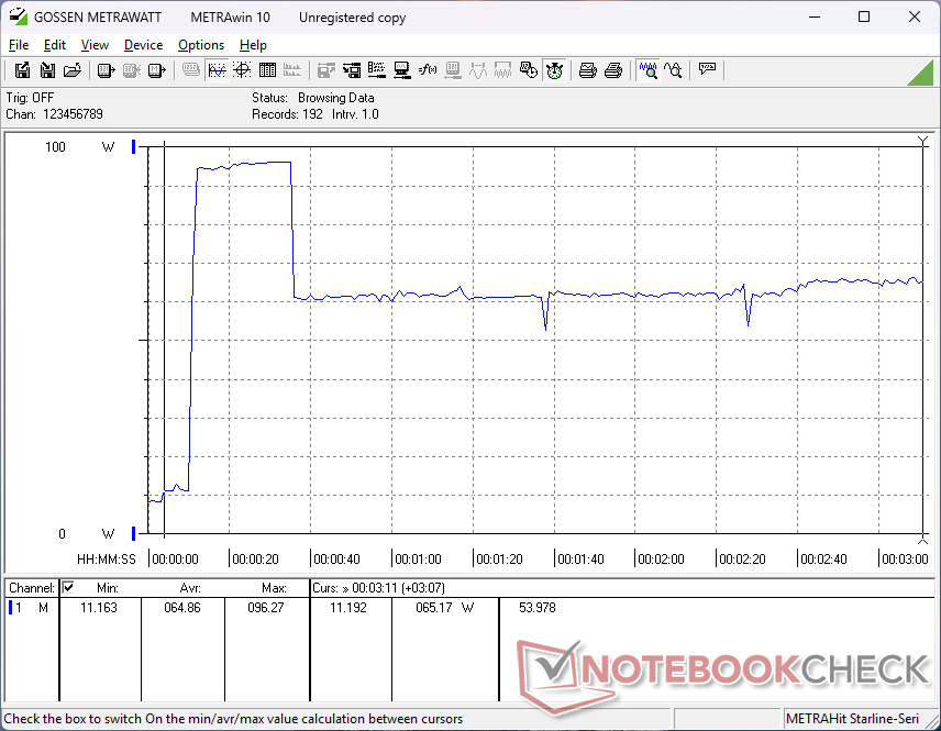 La configuración Core Ultra X7 OLED es en general más exigente que la configuración básica Core Ultra 5 IPS incluso en reposo debido al panel OLED. Ejecutar Cyberpunk 2077 y Prime95 consume alrededor de un 38 y un 35 por ciento más de energía, respectivamente. Sin embargo, el aumento del rendimiento compensa con creces la mayor demanda de energía, por lo que el rendimiento por vatio sigue siendo superior con la opción Core Ultra X7.