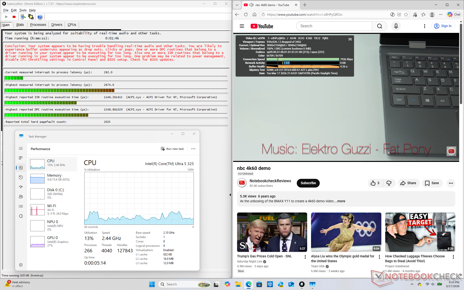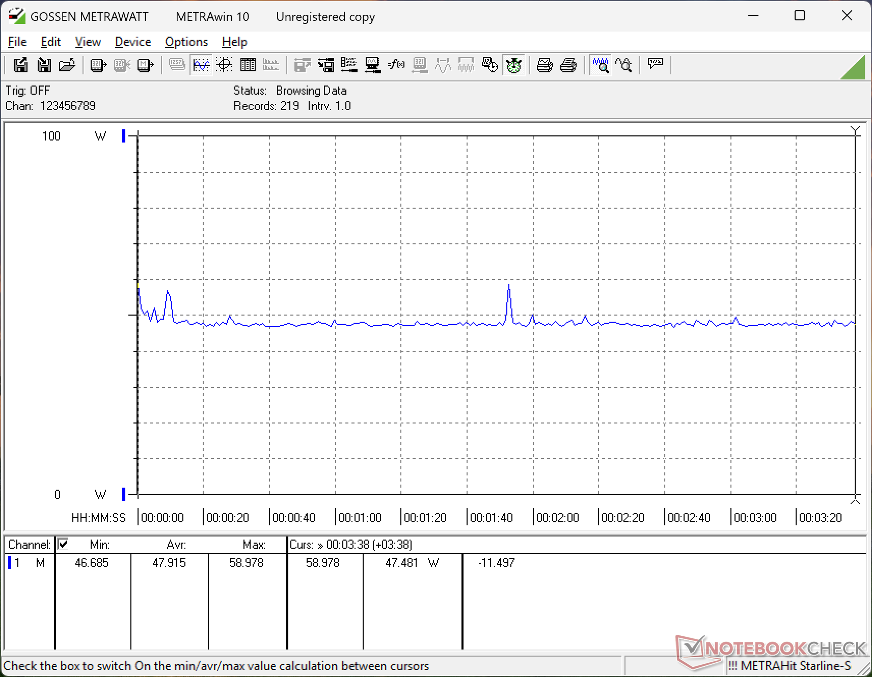Panther Lake adopta la eficiencia de Lunar Lake-V con el rendimiento bruto de Arrow Lake-H para obtener lo mejor de ambos mundos. En reposo en el escritorio con el ajuste de brillo más bajo consumiría sólo 1,3 W, lo que es extremadamente bajo especialmente para un factor de forma de 16 pulgadas. El consumo se mantendría muy bajo, justo por debajo de los 50 W, al ejecutar juegos debido a la falta de una GPU discreta. Si se configura con el Core Ultra X7 en su lugar, el consumo al jugar sería sólo unos pocos vatios más basado en nuestro tiempo con el XPS 14 para unos de los números más altos de rendimiento por vatio de cualquier portátil con iGPU.