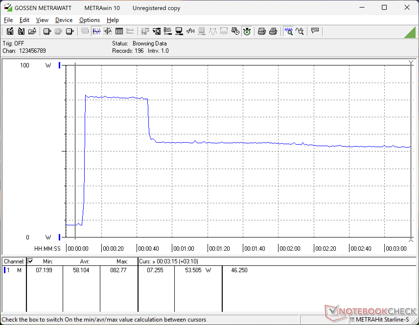 Somos capaces de registrar un consumo máximo temporal de 83 W desde el pequeño (~10,2 x 5,5 x 2,2 cm) adaptador universal USB-C AC de 100 W cuando la CPU está totalmente estresada.