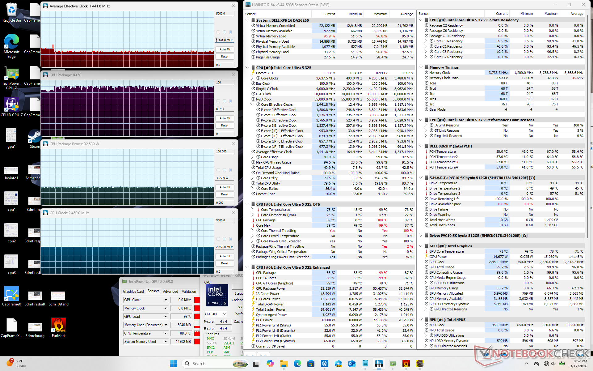 Al ejecutar Cyberpunk 2077 para representar una carga CPU-GPU más equilibrada, la temperatura del núcleo se estabilizaría en unos muy tostados 89 C en comparación con los 75 C de la XPS 16 2025 con gráficos GeForce RTX más rápidos. Las temperaturas generalmente más cálidas del núcleo son probablemente responsables de las temperaturas superficiales más cálidas mencionadas anteriormente.