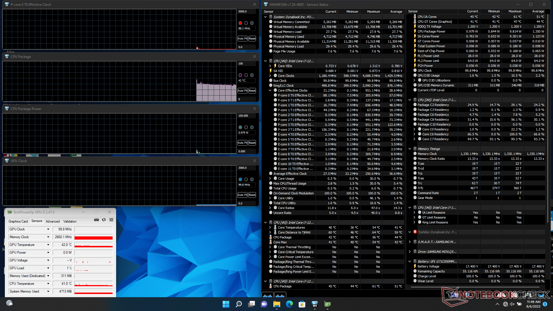 La velocidad de reloj de la GPU y la temperatura en funcionamiento Witcher 3 se estabilizan en 1397 MHz y 75 C, respectivamente, frente a los 1147 MHz y 65 C del Lenovo Yoga 9 14 equipado con la misma CPU Core i7-1260P.