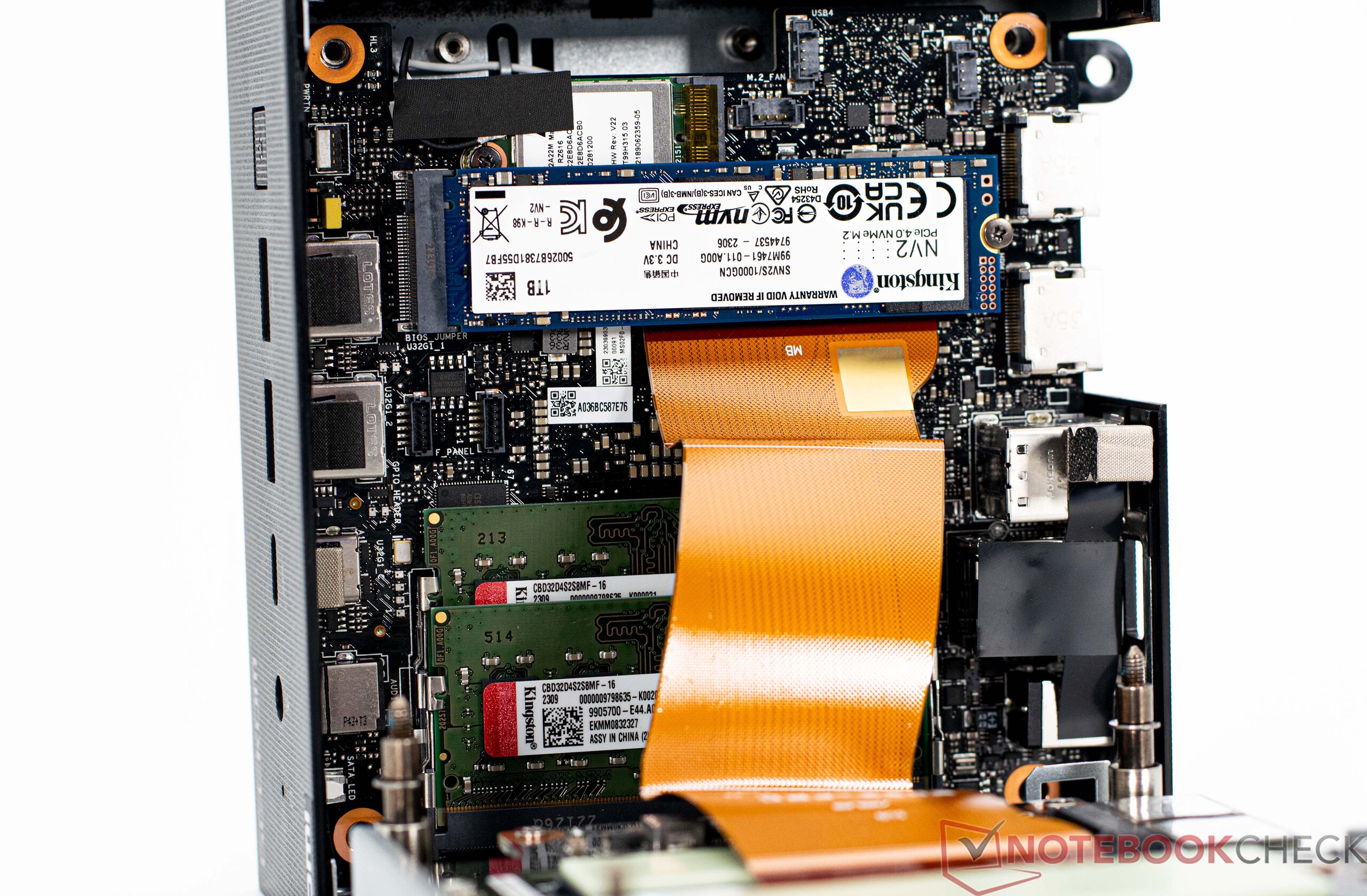 El Geekom AS 5 se puede abrir a través de la base. Los cuatro tornillos forman parte del soporte y mantienen la base, junto con algunos puertos de comunicación en la parte superior de parte del chasis. Retirar la cubierta inferior no es difícil, aunque la almohadilla térmica del SSD ofrece cierta resistencia. Básicamente, acceder a los componentes integrados, como la RAM y el SSD, es pan comido. Sin embargo, quien desee inspeccionar la unidad de refrigeración tendrá que desmontar un poco más el dispositivo. Sin embargo, sólo debe proceder con precaución para evitar dañar los delicados cables de la antena Wi-Fi.