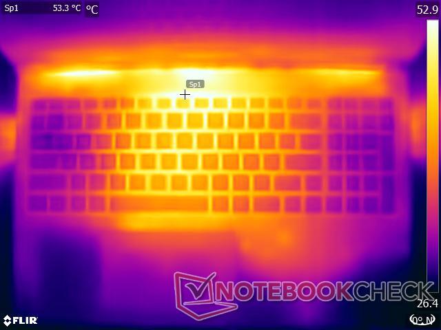 (-) La temperatura máxima en la parte superior es de 52.6 °C / 127 F, frente a la media de 40.4 °C / 105 F, que oscila entre 21.2 y 68.8 °C para la clase Gaming.