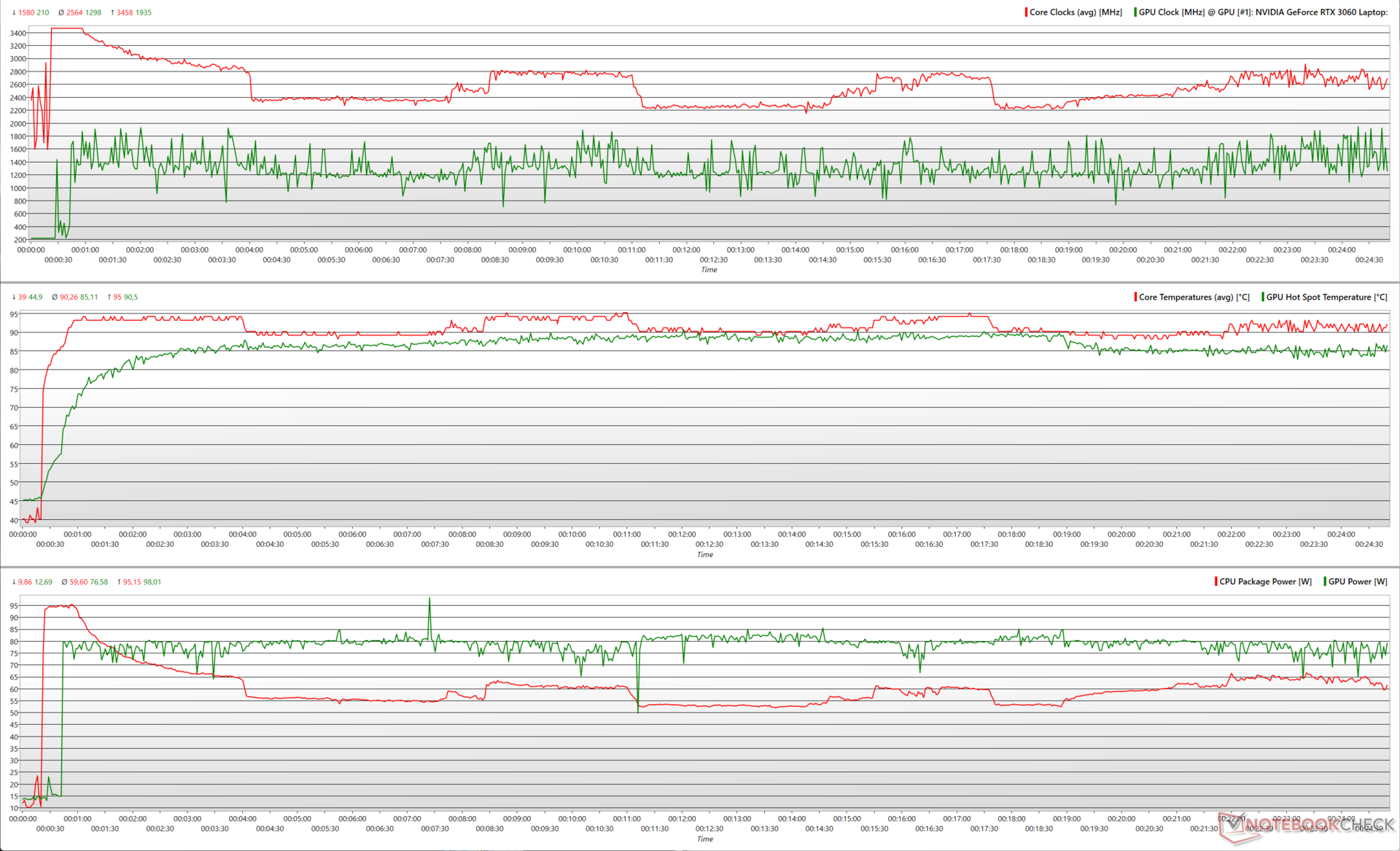 En una prueba combinada de Prime95 y FurMark, el Core i5-12500H alcanza brevemente un pico de unos 3,5 GHz a 95 W antes de bajar a unos 2,5 GHz cerca de los 60 W de media. La GPU RTX 3060 Laptop se mantiene en torno a los 75,6 W de media, pero alcanza un pico de 98 W, lo que resulta en un reloj central máximo de 1,9 GHz.